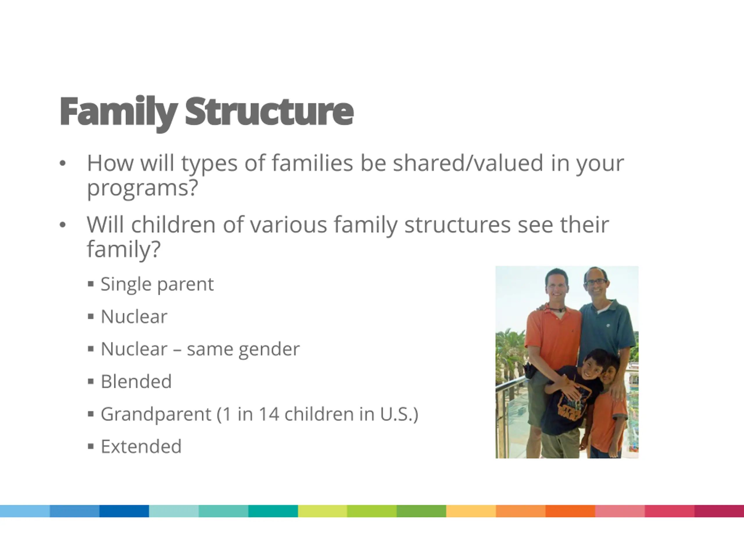 Family Structure Family Structure How will types of families be shared/valued in your programs? Will children of various family structures see their family? Single parent Nuclear Nuclear same gender Blended Grandparent (1 in 14 children in U.S.) Extended