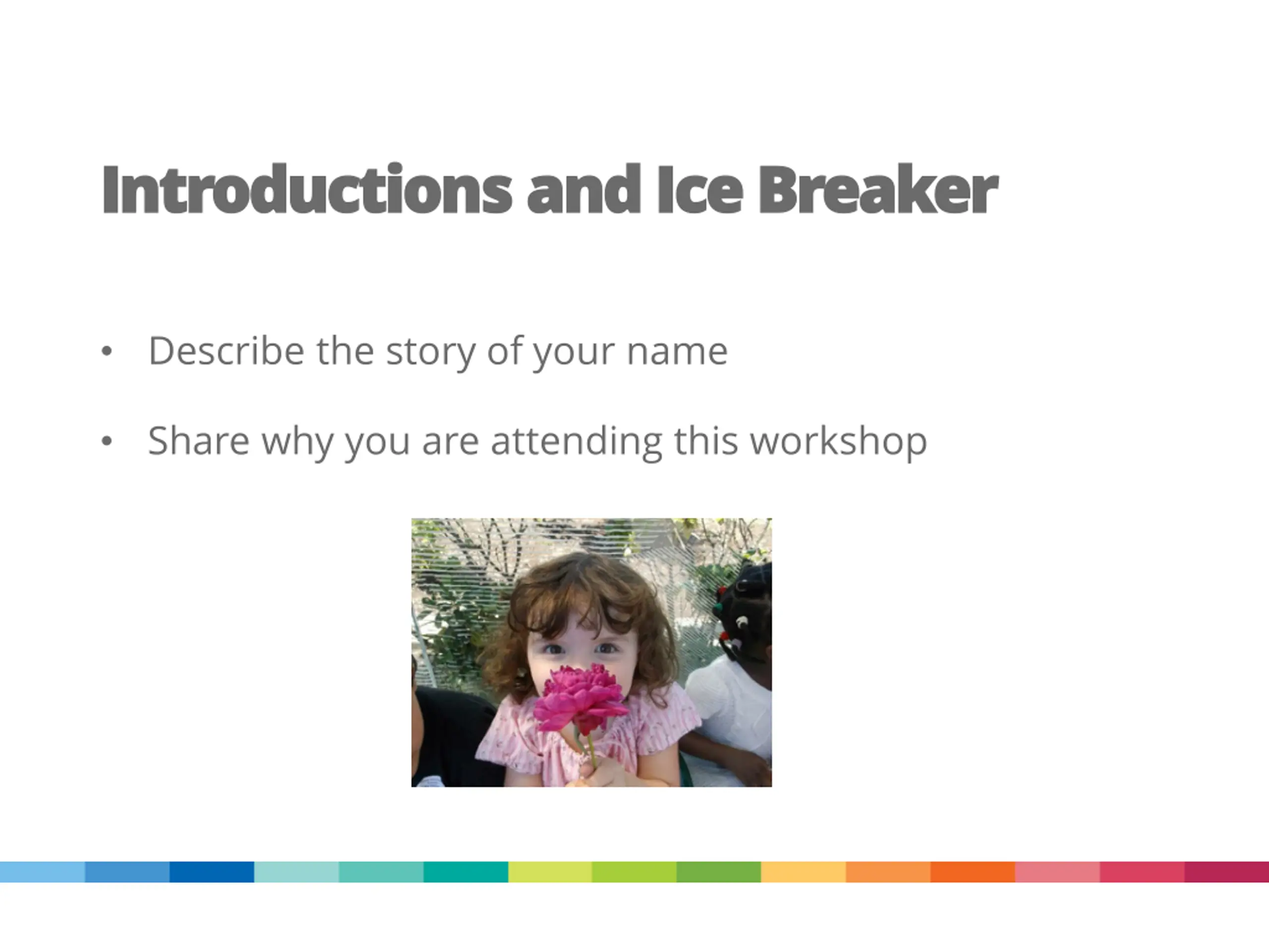 Introductions and Ice Breaker Introductions and Ice Breaker Describe the story of your name Share why you are attending this workshop