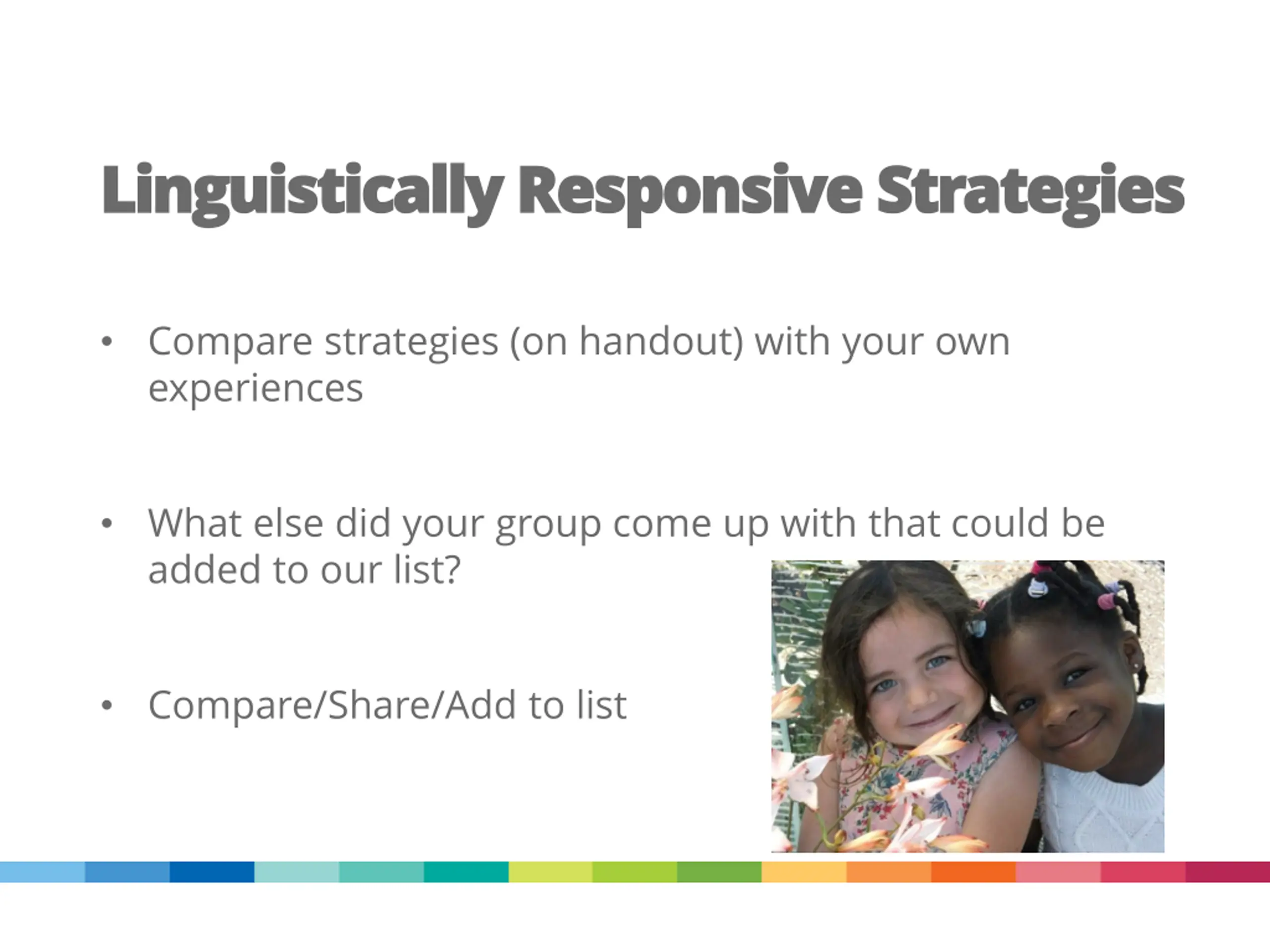 Linguistically Responsive Strategies Linguistically Responsive Strategies Compare strategies (on handout) with your own experiences What else did your group come up with that could be added to our list? Compare/Share/Add to list