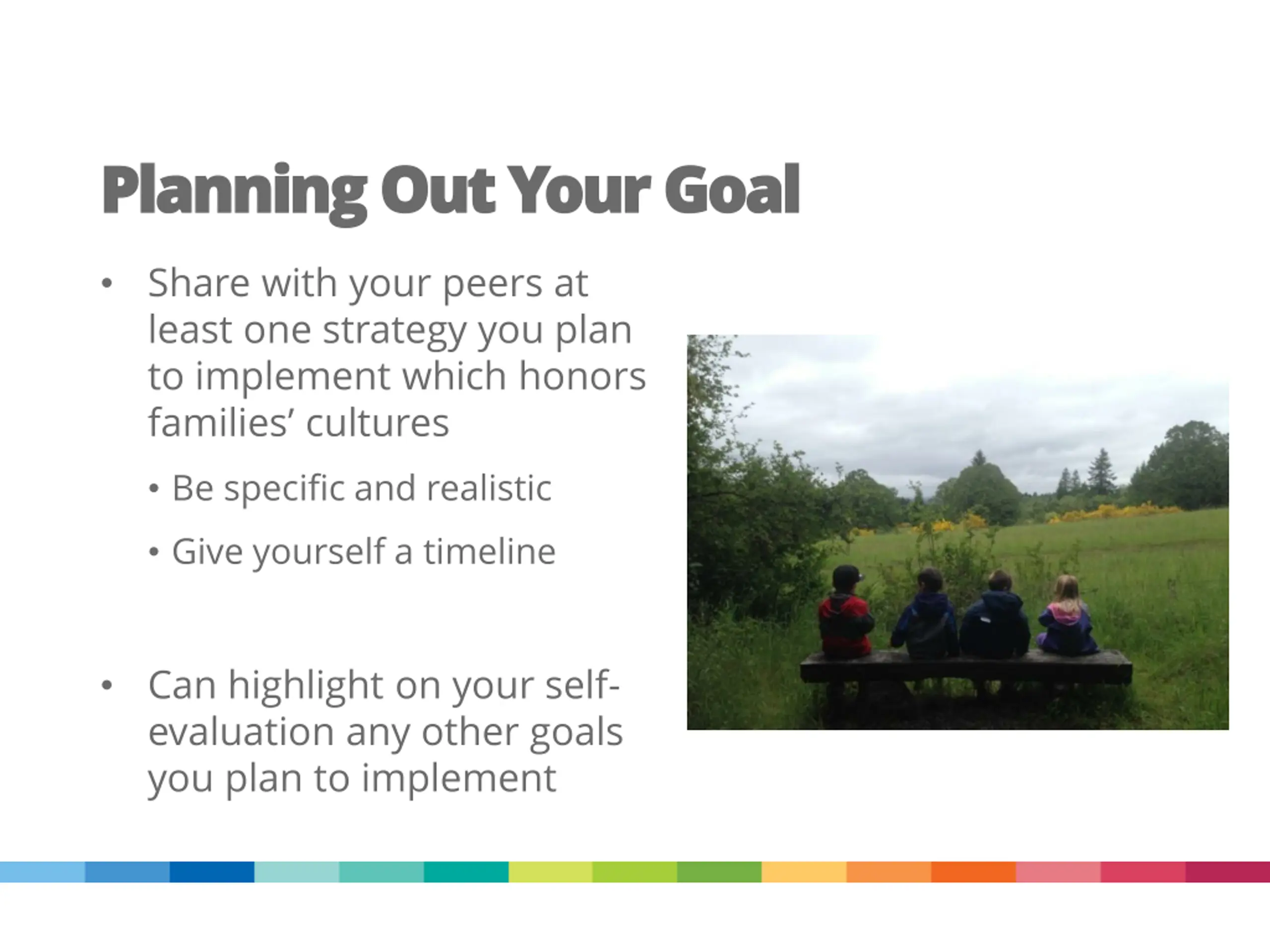 Planning Out Your Goal Planning Out Your Goal Share with your peers at least one strategy you plan to implement which honors families cultures Be specific and realistic Give yourself a timeline Can highlight on your self- evaluation any other goals you plan to implement