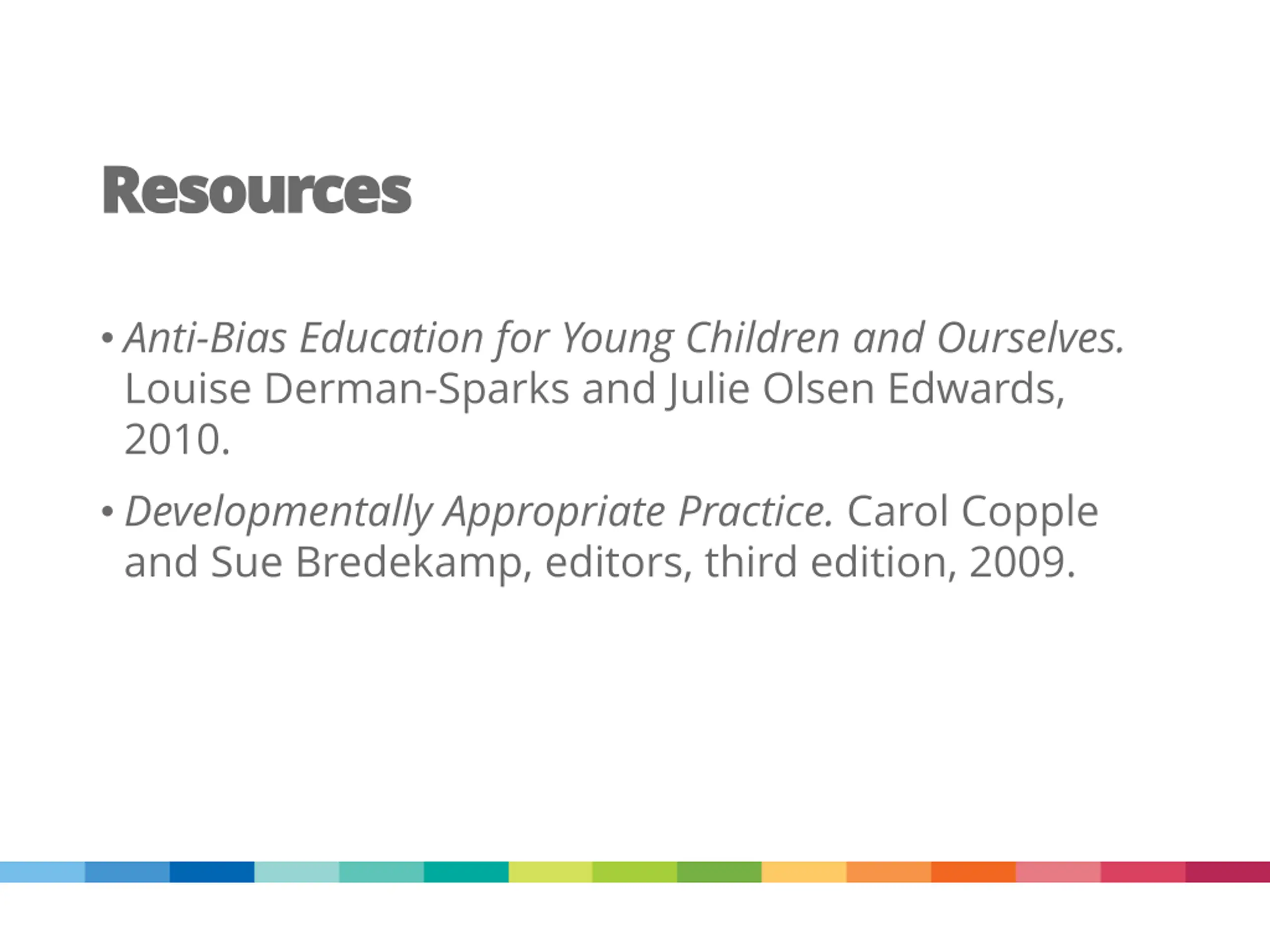 Resources Resources Anti-Bias Education for Young Children and Ourselves. Louise Derman-Sparks and Julie Olsen Edwards, 2010. Developmentally Appropriate Practice. Carol Copple and Sue Bredekamp, editors, third edition, 2009.