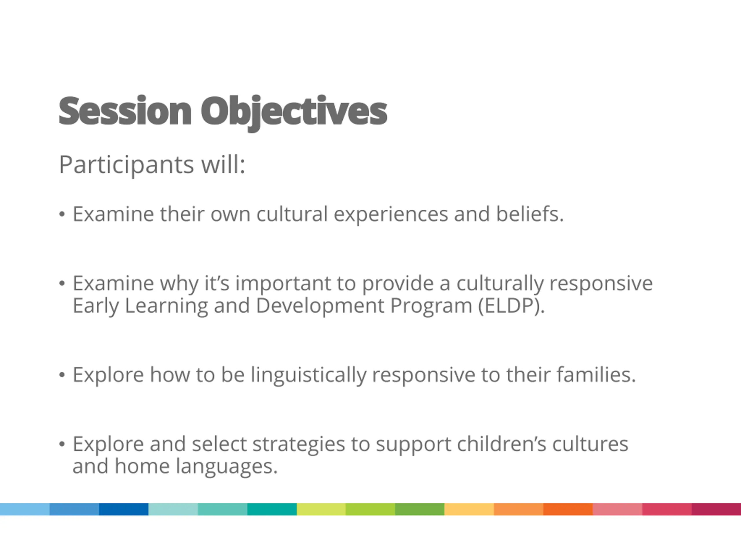 Session Objectives Session Objectives Participants will: Examine their own cultural experiences and beliefs. Examine why it s important to provide a culturally responsive Early Learning and Development Program (ELDP). Explore how to be linguistically responsive to their families. Explore and select strategies to support children s cultures and home languages.