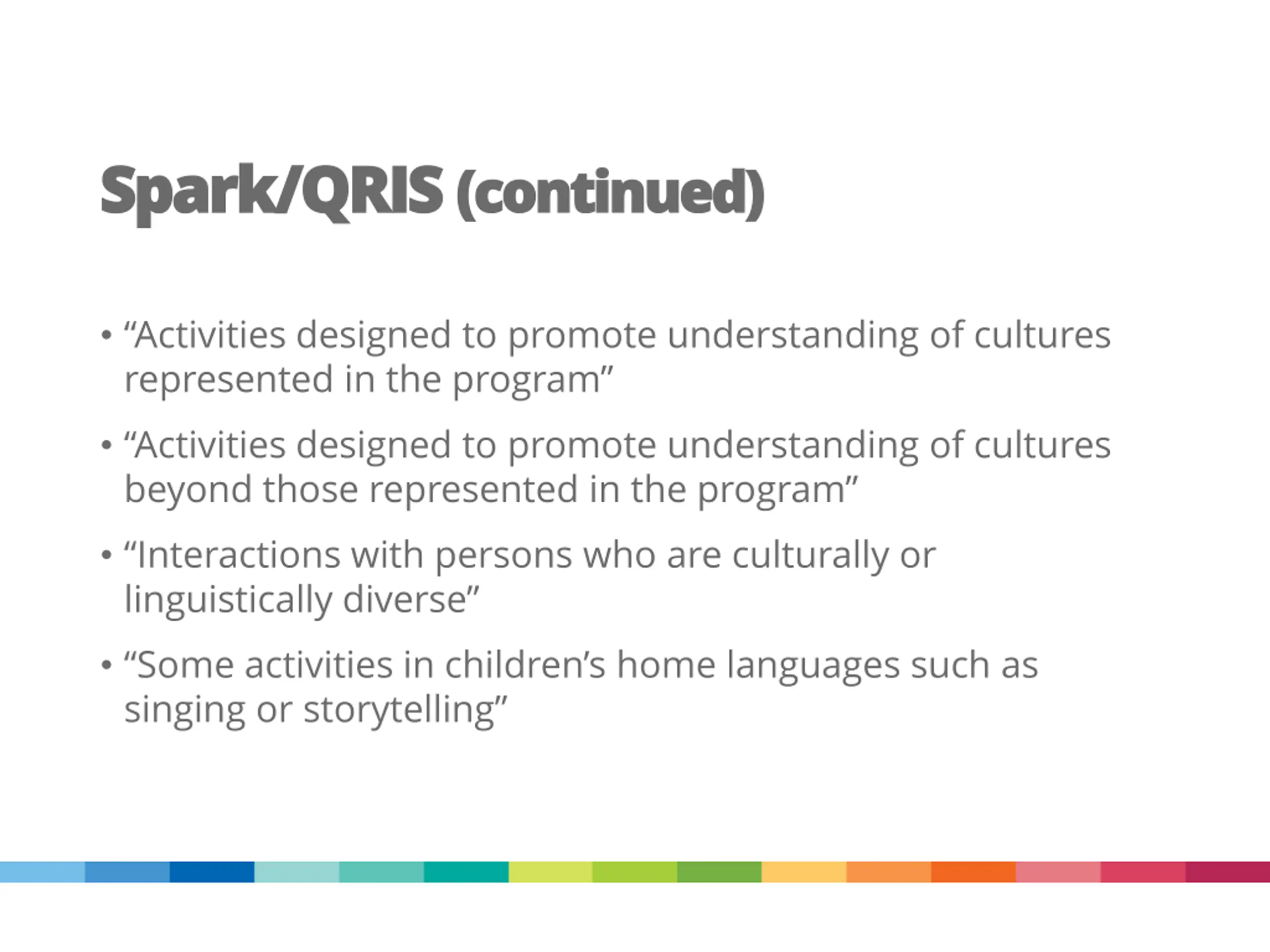 Spark/QRIS Spark/QRIS (continued) (continued) Activities designed to promote understanding of cultures represented in the program Activities designed to promote understanding of cultures beyond those represented in the program Interactions with persons who are culturally or linguistically diverse Some activities in children s home languages such as singing or storytelling