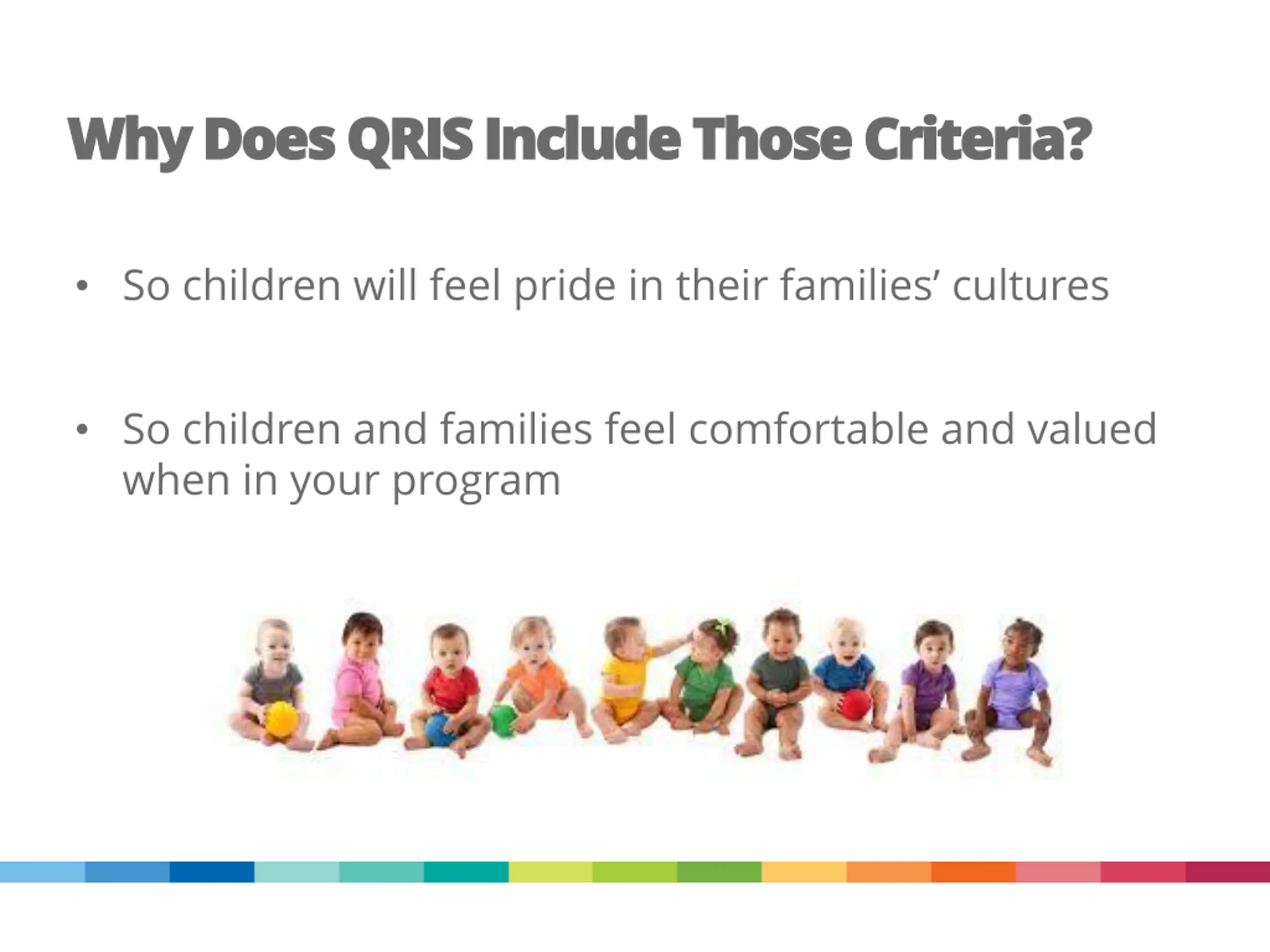 Why Does QRIS Include Those Criteria? Why Does QRIS Include Those Criteria? So children will feel pride in their families cultures So children and families feel comfortable and valued when in your program