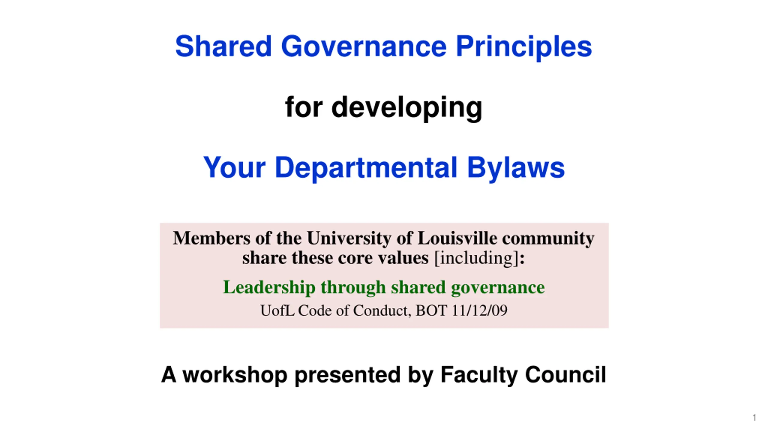 Shared Governance Principles for developing Your Departmental Bylaws Members of the University of Louisville community share these core values [including]: Leadership through shared governance UofL Code of Conduct, BOT 11/12/09 A workshop presented by Faculty Council 1