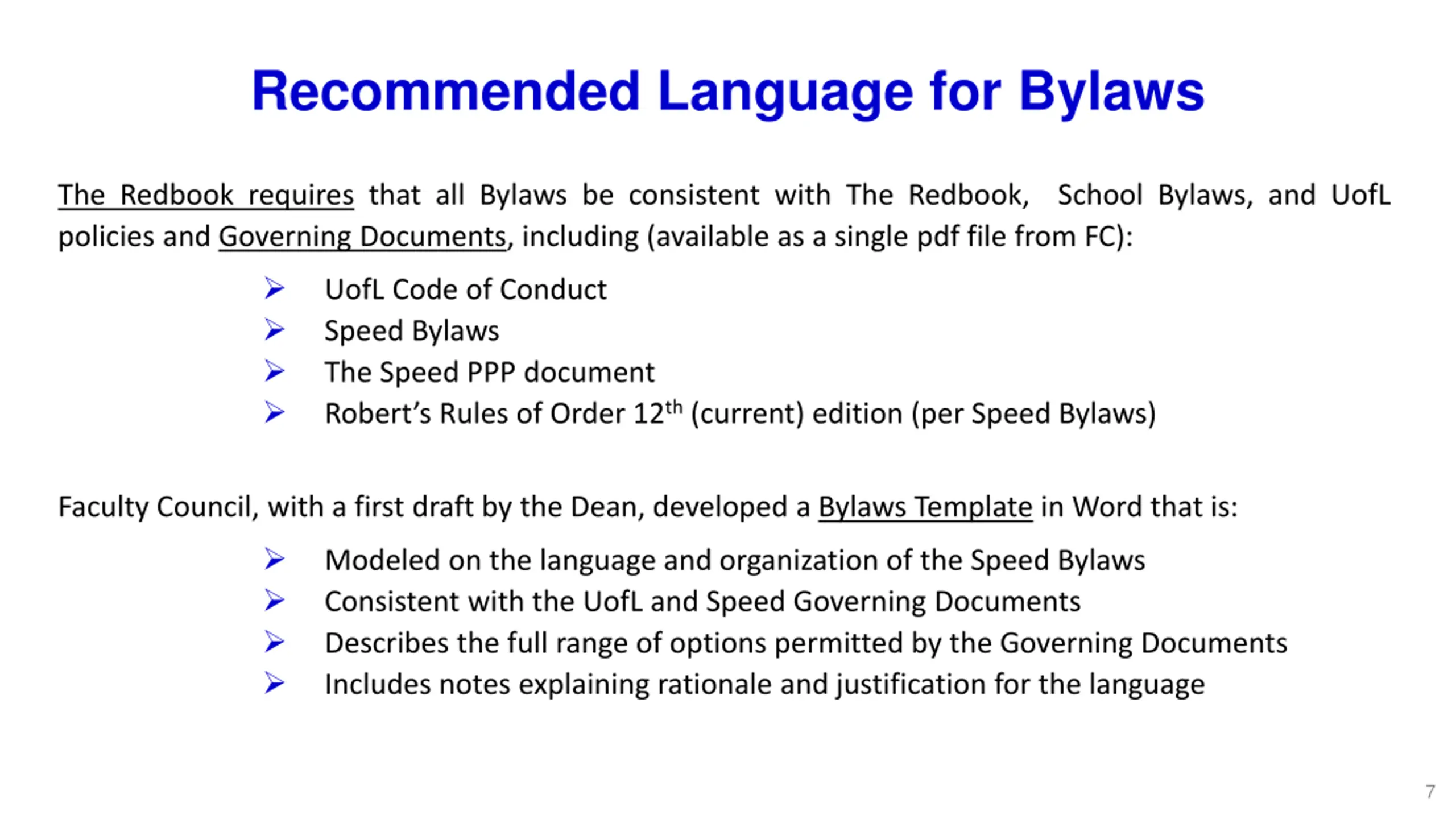 Recommended Language for Bylaws The Redbook requires that all Bylaws be consistent with The Redbook, School Bylaws, and UofL policies and Governing Documents, including (available as a single pdf file from FC): UofL Code of Conduct Speed Bylaws The Speed PPP document Robert s Rules of Order 12th (current) edition (per Speed Bylaws) Faculty Council, with a first draft by the Dean, developed a Bylaws Template in Word that is: Modeled on the language and organization of the Speed Bylaws Consistent with the UofL and Speed Governing Documents Describes the full range of options permitted by the Governing Documents Includes notes explaining rationale and justification for the language 7