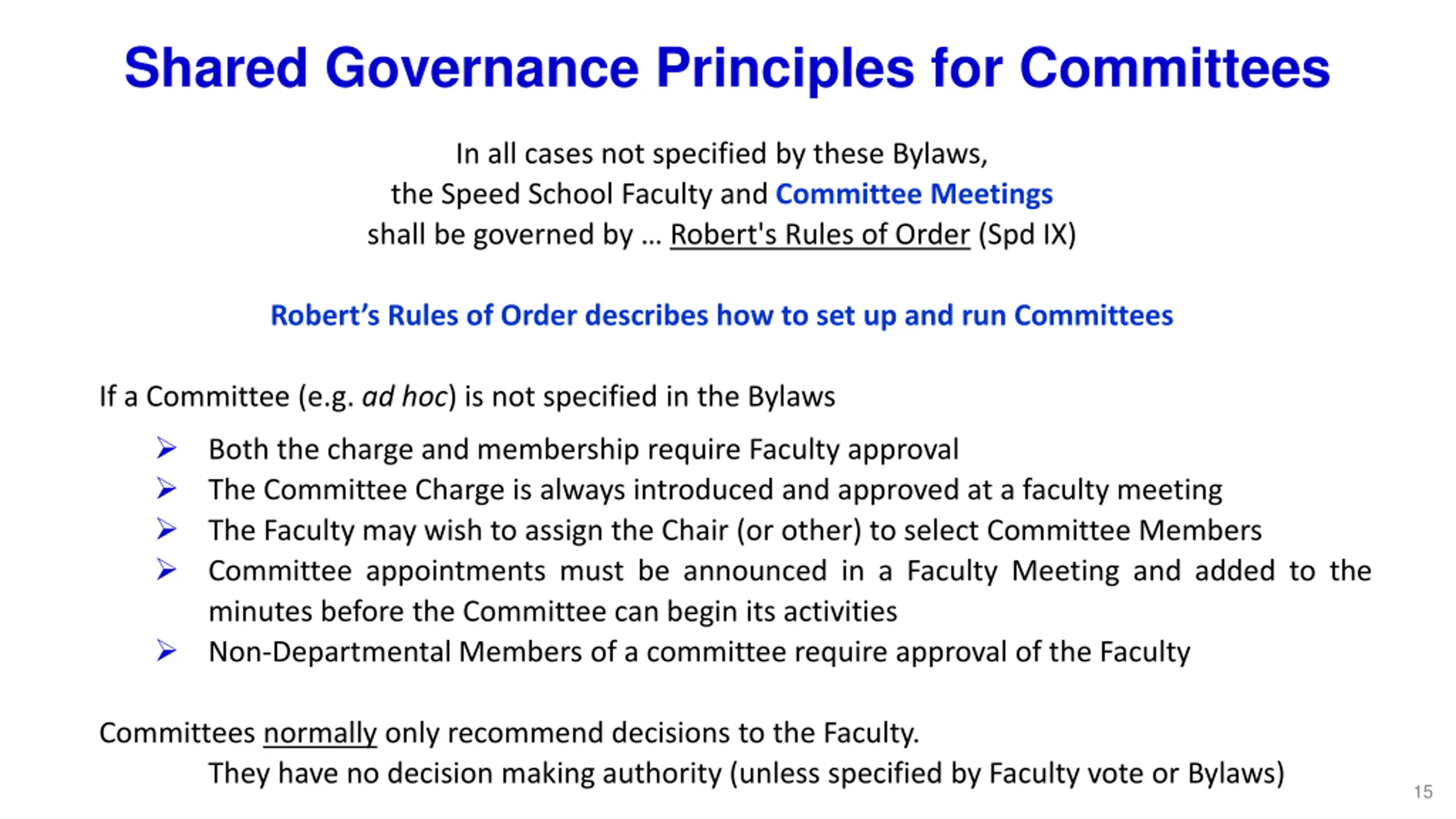 Shared Governance Principles for Committees In all cases not specified by these Bylaws, the Speed School Faculty and Committee Meetings shall be governed by Robert's Rules of Order (Spd IX) Robert s Rules of Order describes how to set up and run Committees If a Committee (e.g. ad hoc) is not specified in the Bylaws Both the charge and membership require Faculty approval The Committee Charge is always introduced and approved at a faculty meeting The Faculty may wish to assign the Chair (or other) to select Committee Members Committee appointments must be announced in a Faculty Meeting and added to the minutes before the Committee can begin its activities Non-Departmental Members of a committee require approval of the Faculty Committees normally only recommend decisions to the Faculty. They have no decision making authority (unless specified by Faculty vote or Bylaws) 15