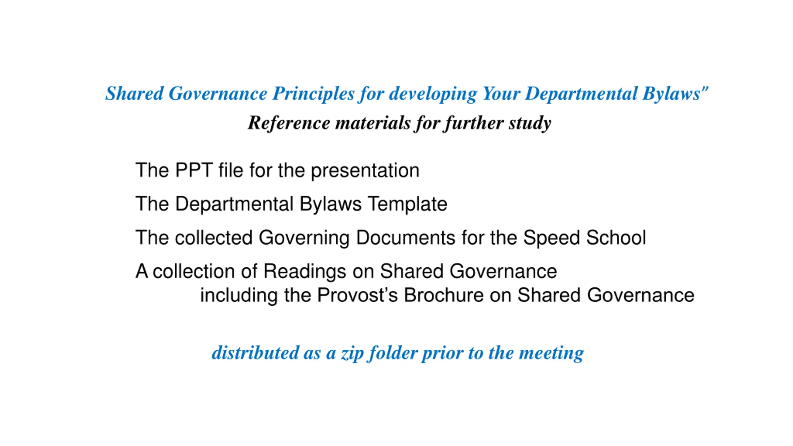 Shared Governance Principles for developing Your Departmental Bylaws Reference materials for further study The PPT file for the presentation The Departmental Bylaws Template The collected Governing Documents for the Speed School A collection of Readings on Shared Governance including the Provost s Brochure on Shared Governance distributed as a zip folder prior to the meeting