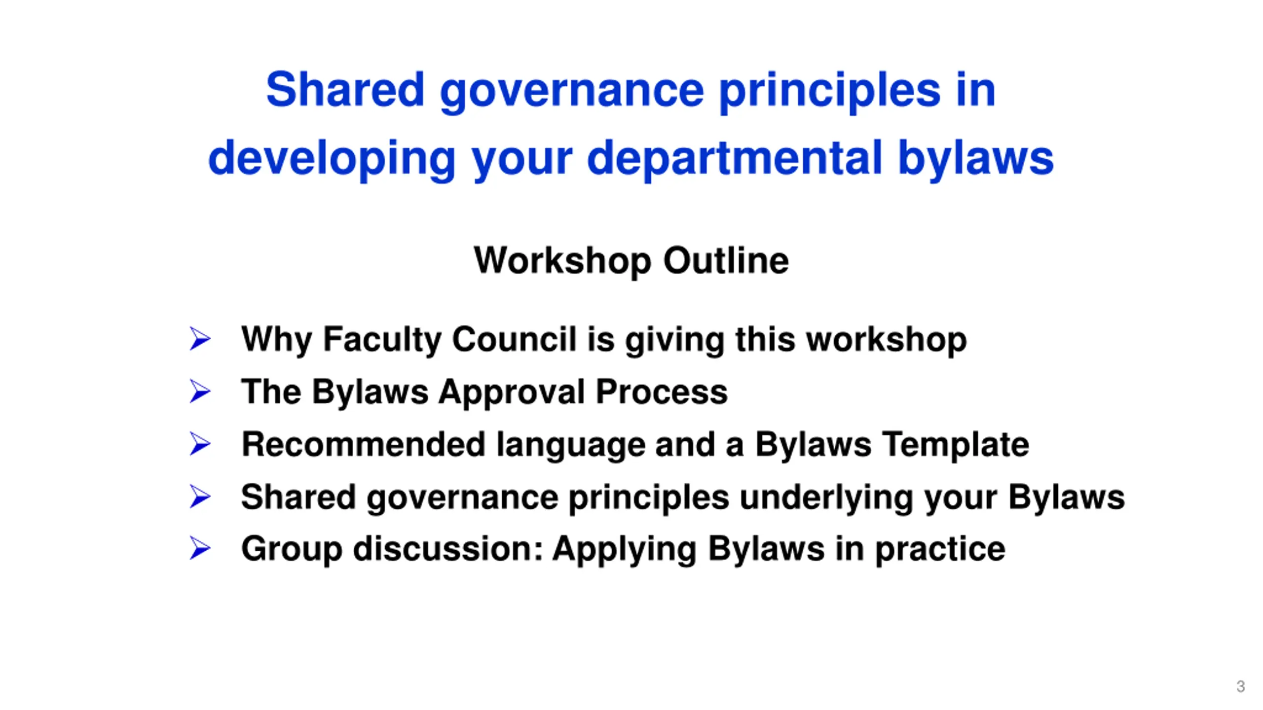 Shared governance principles in developing your departmental bylaws Workshop Outline Why Faculty Council is giving this workshop The Bylaws Approval Process Recommended language and a Bylaws Template Shared governance principles underlying your Bylaws Group discussion: Applying Bylaws in practice 3