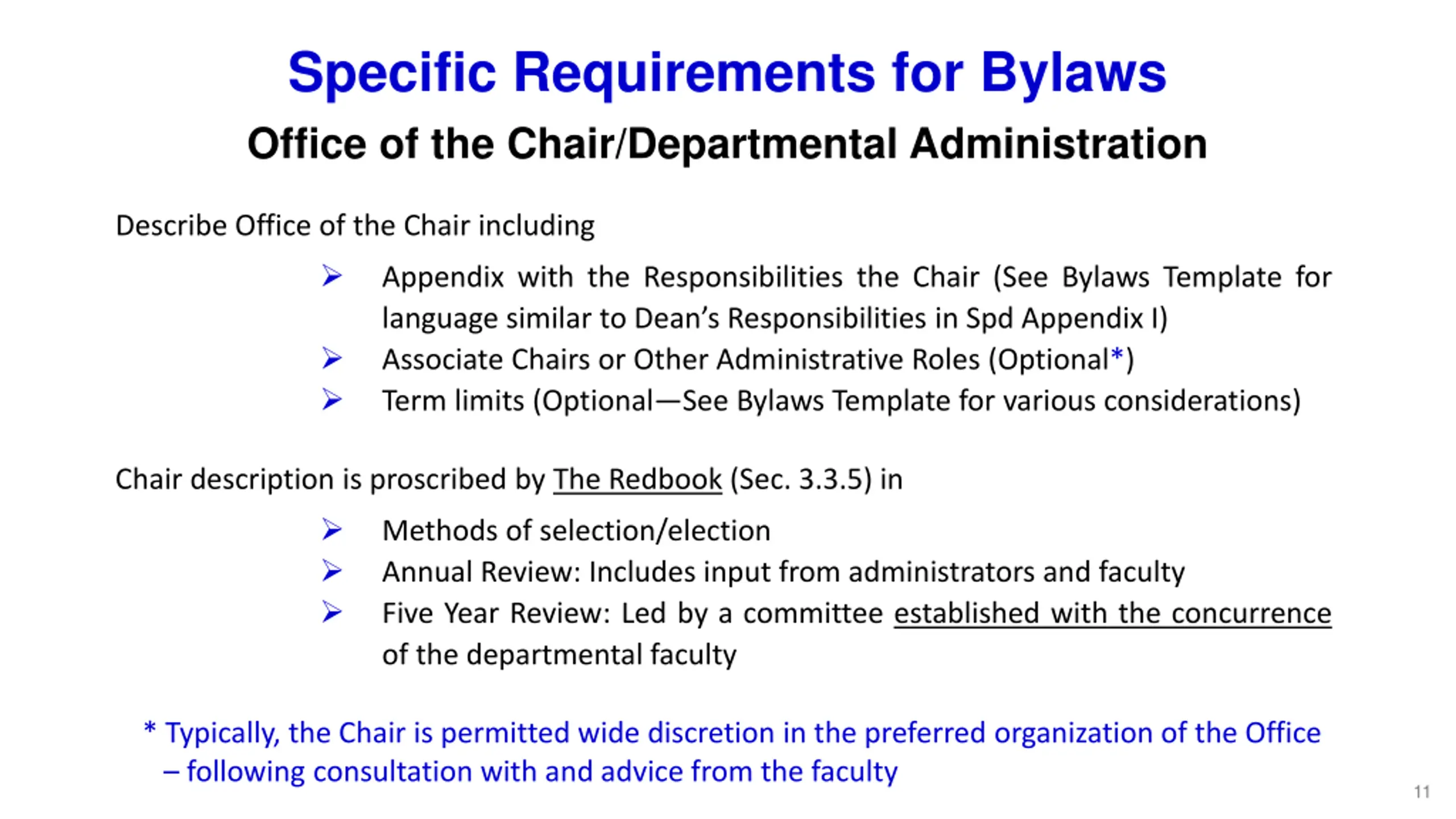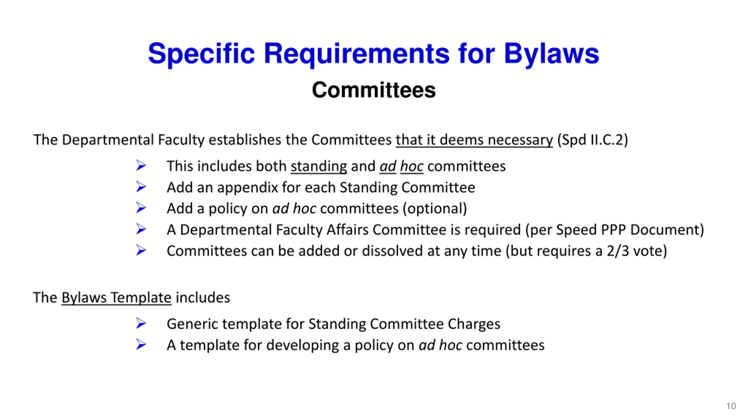 Specific Requirements for Bylaws Committees The Departmental Faculty establishes the Committees that it deems necessary (Spd II.C.2) This includes both standing and ad hoc committees Add an appendix for each Standing Committee Add a policy on ad hoc committees (optional) A Departmental Faculty Affairs Committee is required (per Speed PPP Document) Committees can be added or dissolved at any time (but requires a 2/3 vote) The Bylaws Template includes Generic template for Standing Committee Charges A template for developing a policy on ad hoc committees 10