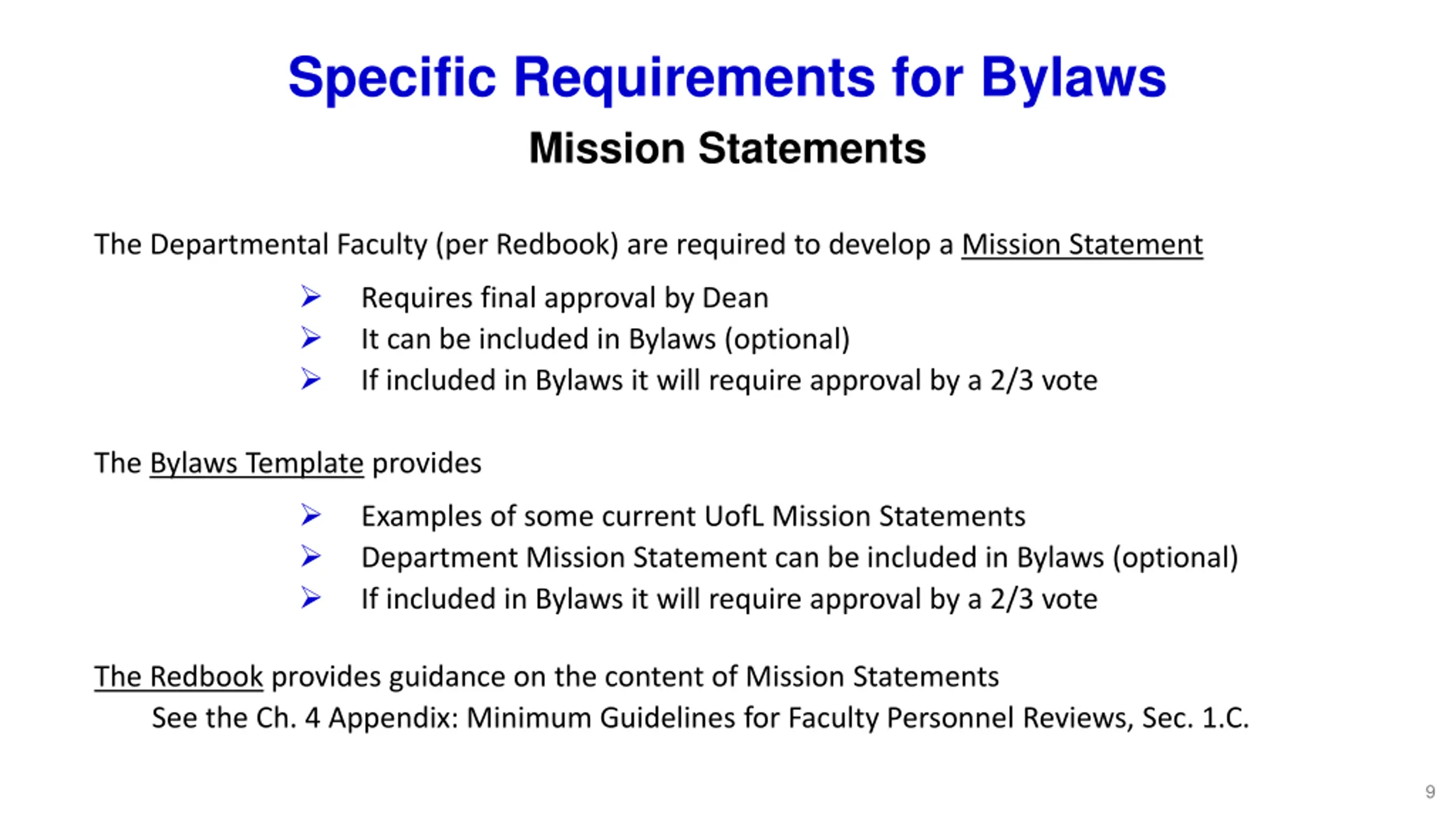 Specific Requirements for Bylaws Mission Statements The Departmental Faculty (per Redbook) are required to develop a Mission Statement Requires final approval by Dean It can be included in Bylaws (optional) If included in Bylaws it will require approval by a 2/3 vote The Bylaws Template provides Examples of some current UofL Mission Statements Department Mission Statement can be included in Bylaws (optional) If included in Bylaws it will require approval by a 2/3 vote The Redbook provides guidance on the content of Mission Statements See the Ch. 4 Appendix: Minimum Guidelines for Faculty Personnel Reviews, Sec. 1.C. 9