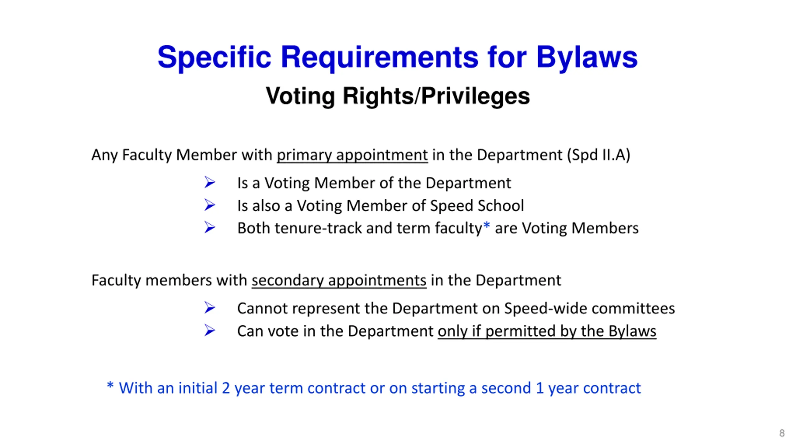 Specific Requirements for Bylaws Voting Rights/Privileges Any Faculty Member with primary appointment in the Department (Spd II.A) Is a Voting Member of the Department Is also a Voting Member of Speed School Both tenure-track and term faculty* are Voting Members Faculty members with secondary appointments in the Department Cannot represent the Department on Speed-wide committees Can vote in the Department only if permitted by the Bylaws * With an initial 2 year term contract or on starting a second 1 year contract 8