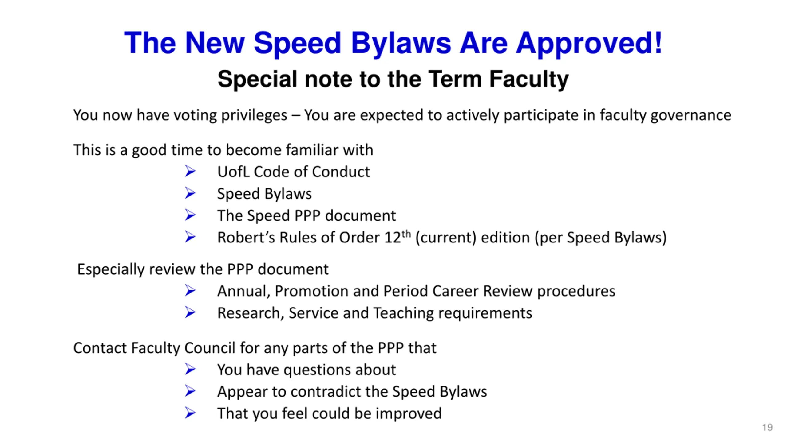 The New Speed Bylaws Are Approved! Special note to the Term Faculty You now have voting privileges You are expected to actively participate in faculty governance This is a good time to become familiar with UofL Code of Conduct Speed Bylaws The Speed PPP document Robert s Rules of Order 12th (current) edition (per Speed Bylaws) Especially review the PPP document Annual, Promotion and Period Career Review procedures Research, Service and Teaching requirements Contact Faculty Council for any parts of the PPP that You have questions about Appear to contradict the Speed Bylaws That you feel could be improved 19