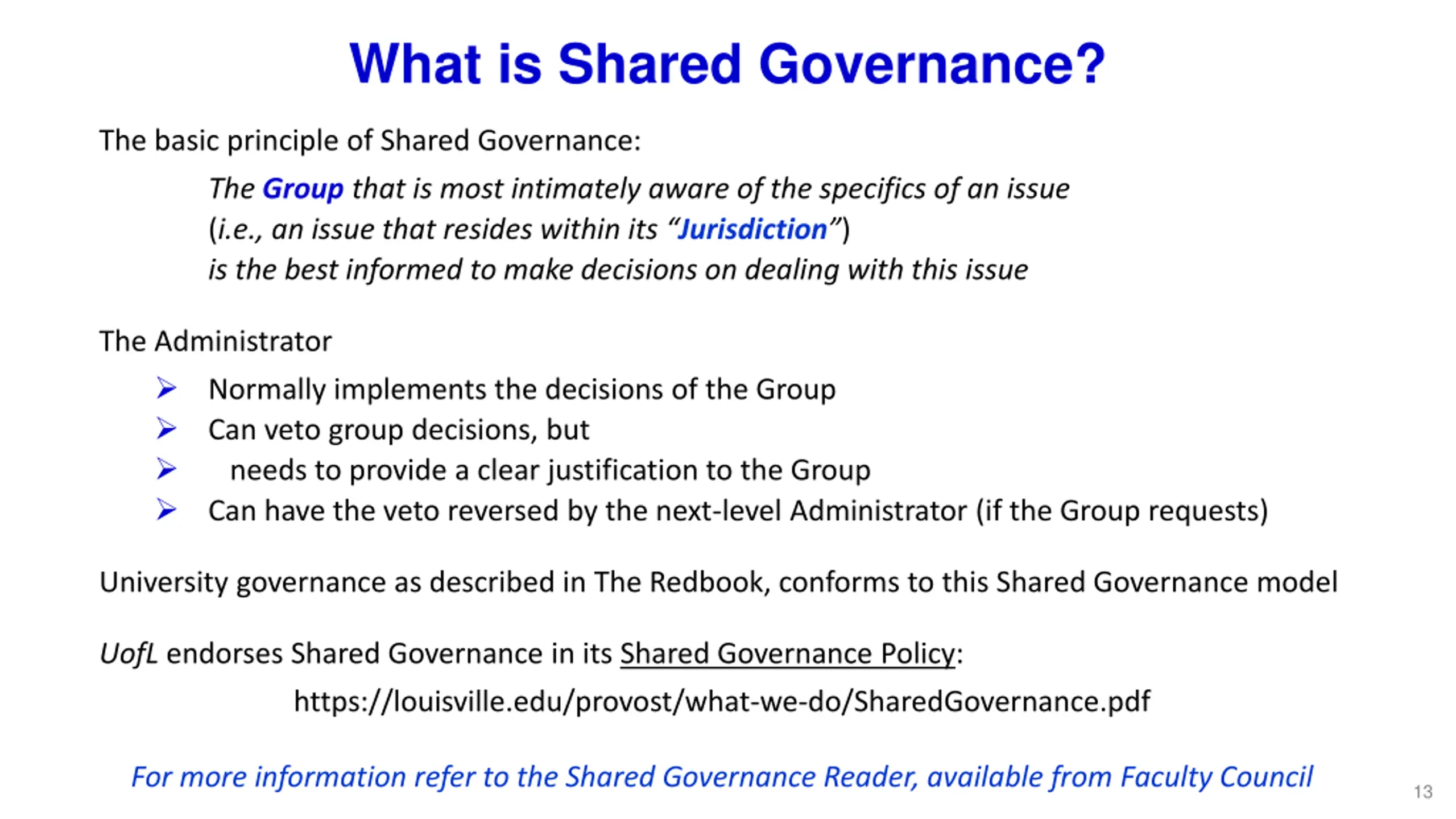 What is Shared Governance? The basic principle of Shared Governance: The Group that is most intimately aware of the specifics of an issue (i.e., an issue that resides within its Jurisdiction ) is the best informed to make decisions on dealing with this issue The Administrator Normally implements the decisions of the Group Can veto group decisions, but needs to provide a clear justification to the Group Can have the veto reversed by the next-level Administrator (if the Group requests) University governance as described in The Redbook, conforms to this Shared Governance model UofL endorses Shared Governance in its Shared Governance Policy: https://louisville.edu/provost/what-we-do/SharedGovernance.pdf For more information refer to the Shared Governance Reader, available from Faculty Council 13