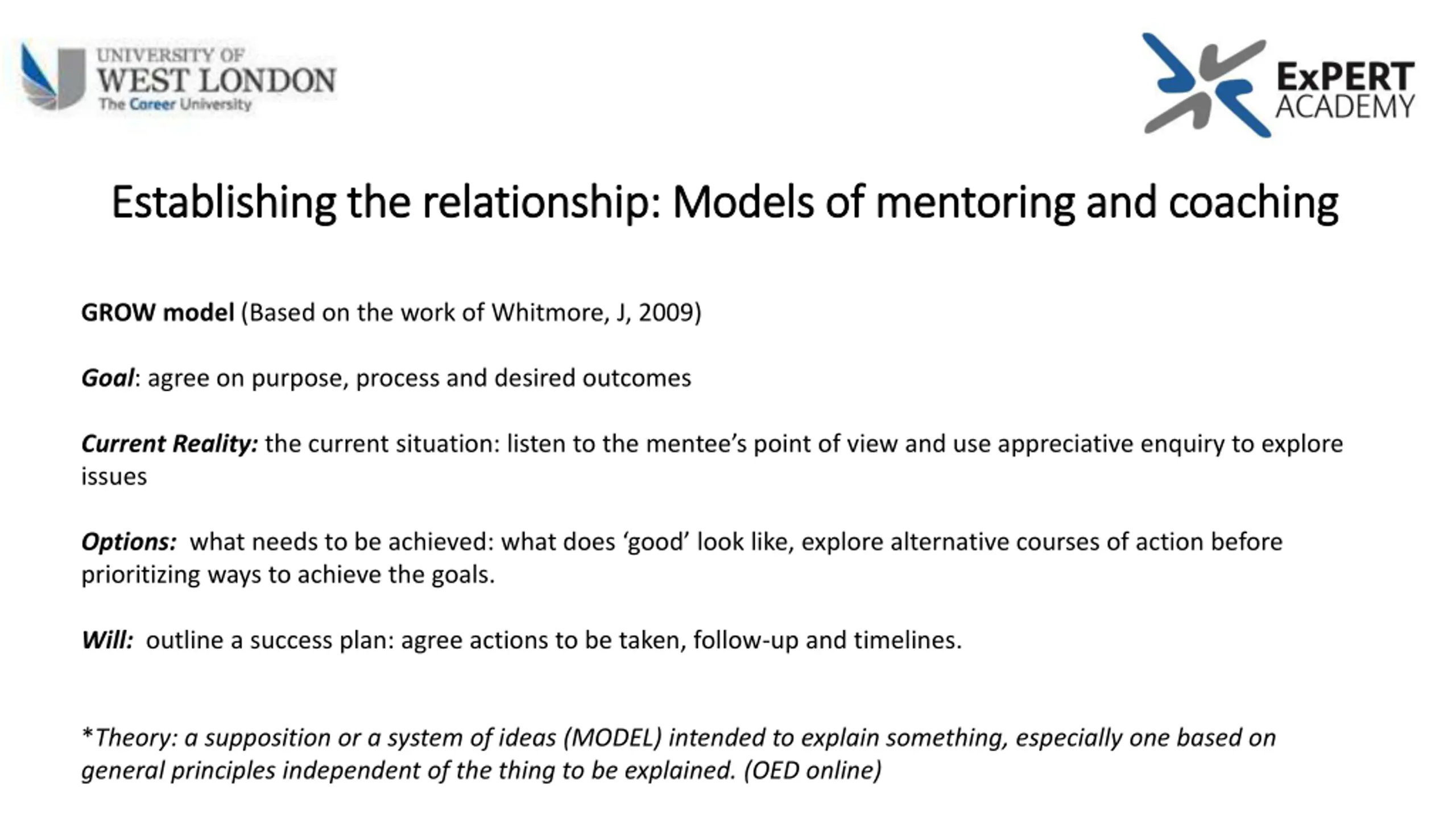 Establishing the relationship: Models of mentoring and coaching Establishing the relationship: Models of mentoring and coaching GROW model (Based on the work of Whitmore, J, 2009) Goal: agree on purpose, process and desired outcomes Current Reality: the current situation: listen to the mentee s point of view and use appreciative enquiry to explore issues Options: what needs to be achieved: what does good look like, explore alternative courses of action before prioritizing ways to achieve the goals. Will: outline a success plan: agree actions to be taken, follow-up and timelines. *Theory: a supposition or a system of ideas (MODEL) intended to explain something, especially one based on general principles independent of the thing to be explained. (OED online)