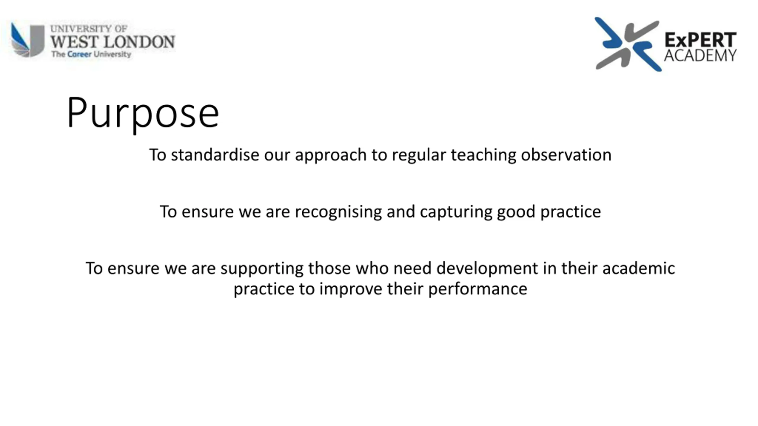 Purpose To standardise our approach to regular teaching observation To ensure we are recognising and capturing good practice To ensure we are supporting those who need development in their academic practice to improve their performance