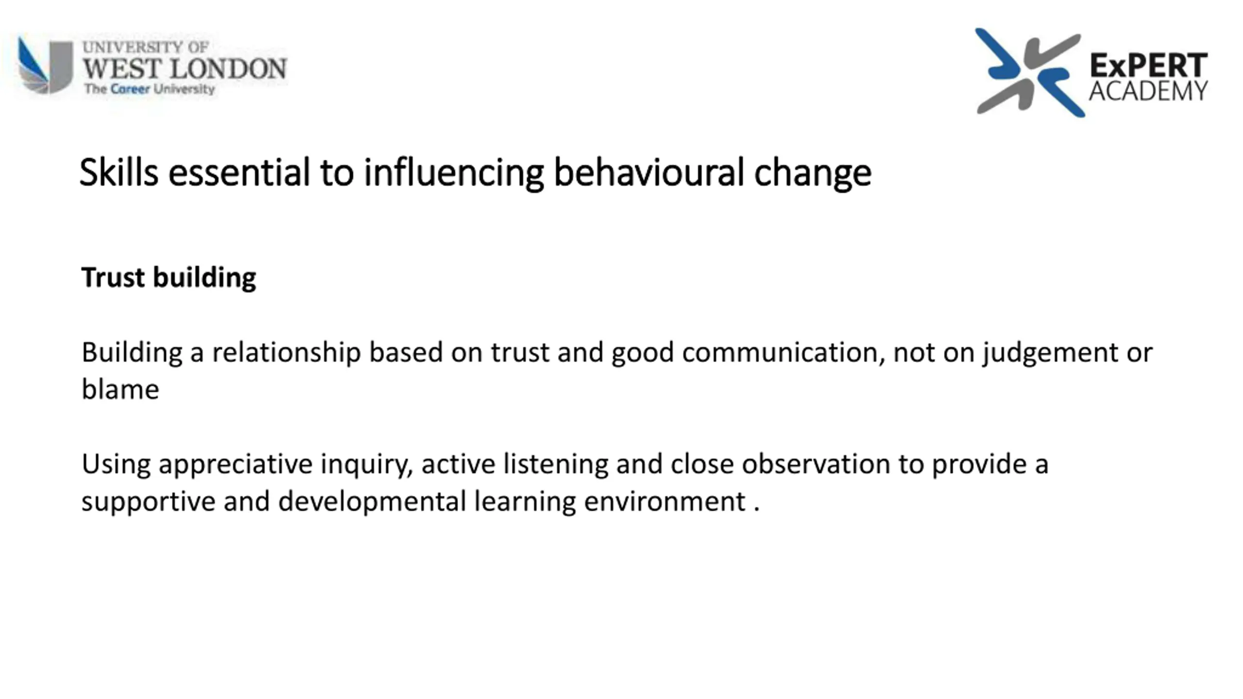 Skills essential to influencing behavioural change Skills essential to influencing behavioural change Trust building Building a relationship based on trust and good communication, not on judgement or blame Using appreciative inquiry, active listening and close observation to provide a supportive and developmental learning environment .