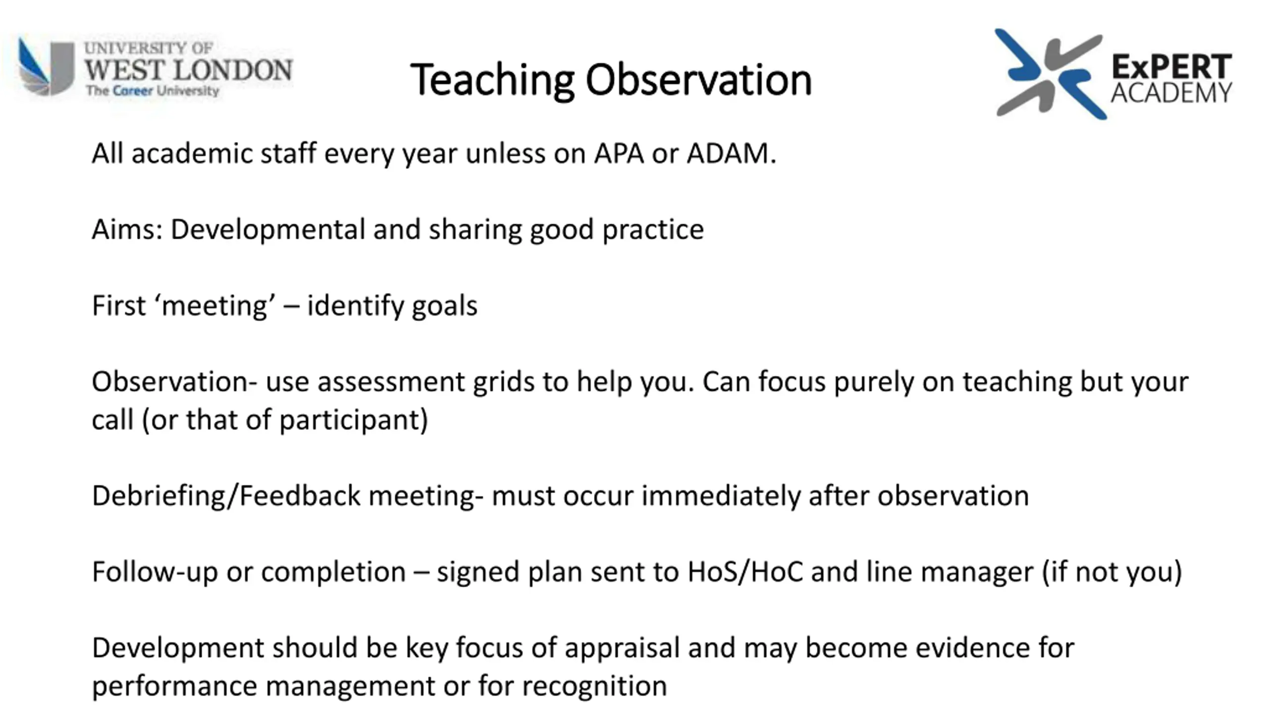 Teaching Observation Teaching Observation All academic staff every year unless on APA or ADAM. Aims: Developmental and sharing good practice First meeting identify goals Observation- use assessment grids to help you. Can focus purely on teaching but your call (or that of participant) Debriefing/Feedback meeting- must occur immediately after observation Follow-up or completion signed plan sent to HoS/HoC and line manager (if not you) Development should be key focus of appraisal and may become evidence for performance management or for recognition