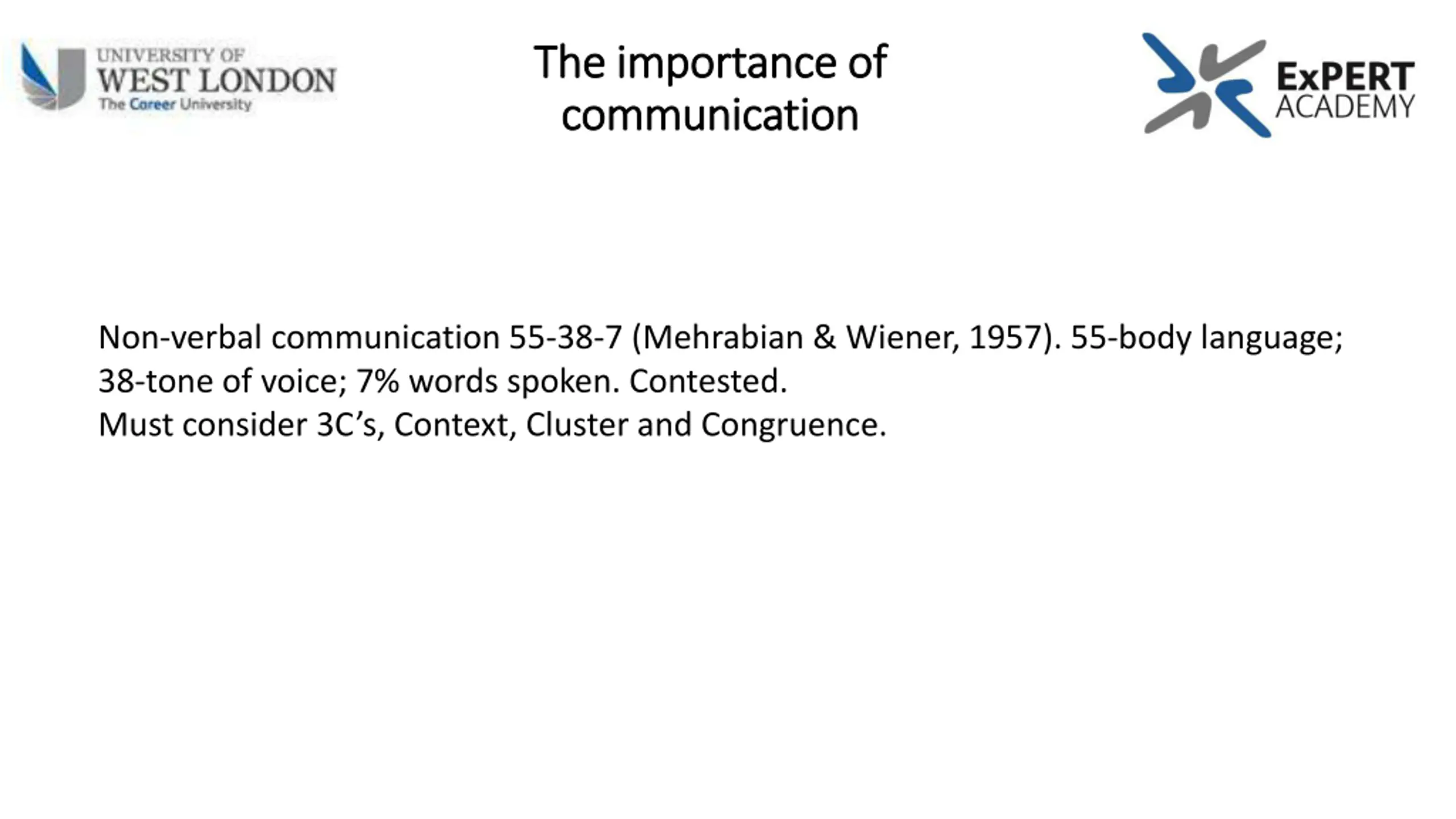 The importance of The importance of communication communication Non-verbal communication 55-38-7 (Mehrabian & Wiener, 1957). 55-body language; 38-tone of voice; 7% words spoken. Contested. Must consider 3C s, Context, Cluster and Congruence.