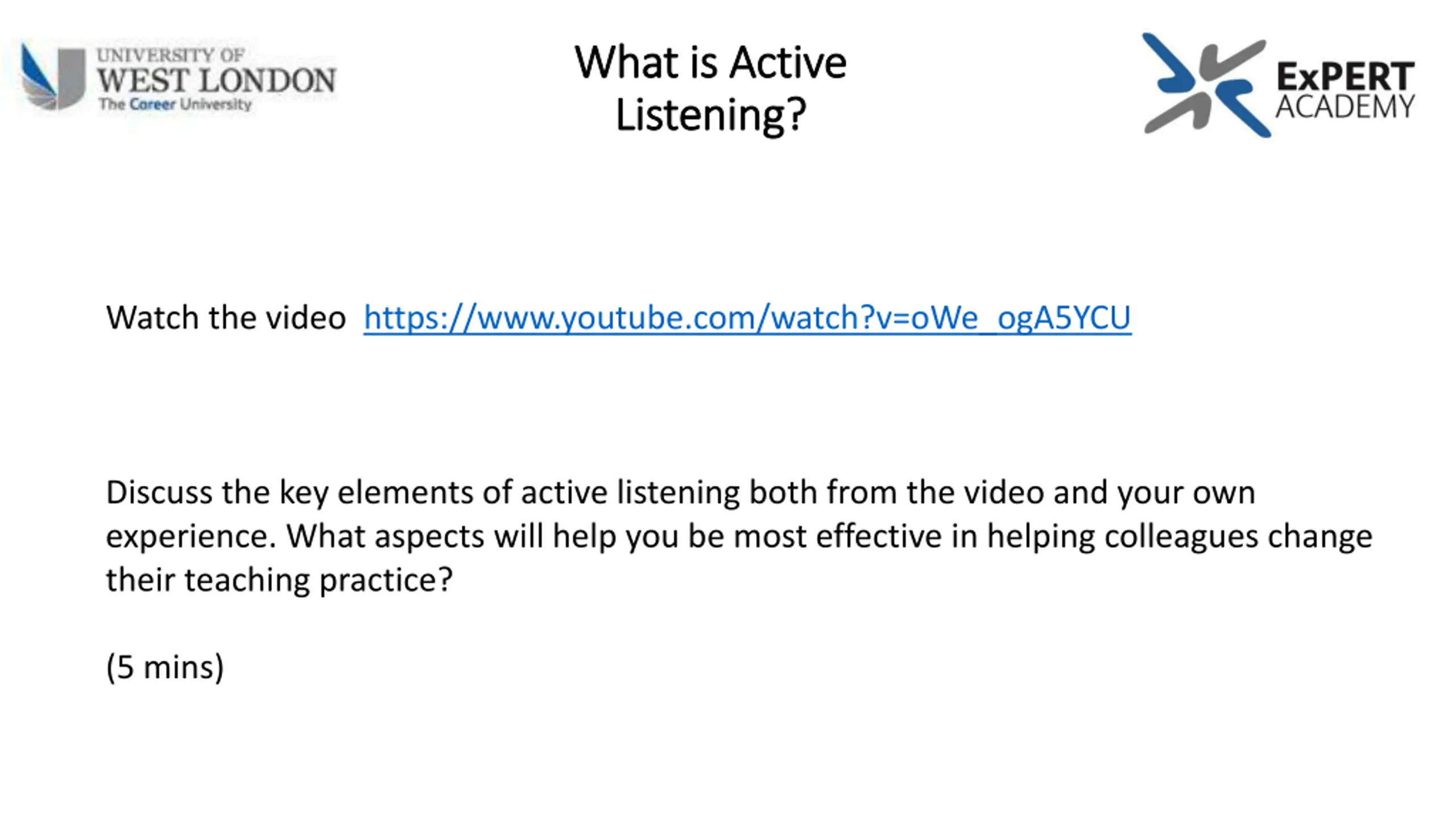What is Active What is Active Listening? Listening? Watch the video https://www.youtube.com/watch?v=oWe_ogA5YCU Discuss the key elements of active listening both from the video and your own experience. What aspects will help you be most effective in helping colleagues change their teaching practice? (5 mins)