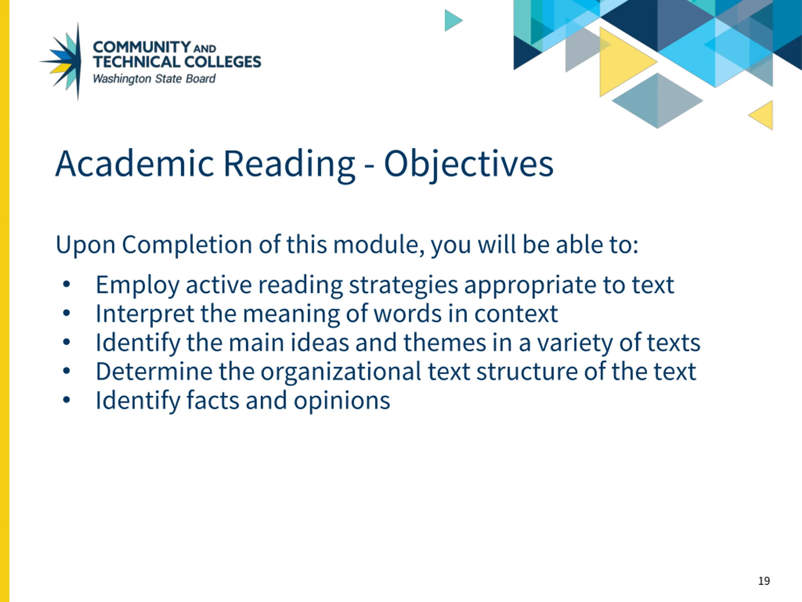 Academic Reading -Objectives Upon Completion of this module, you will be able to: Employ active reading strategies appropriate to text Interpret the meaning of words in context Identify the main ideas and themes in a variety of texts Determine the organizational text structure of the text Identify facts and opinions 19