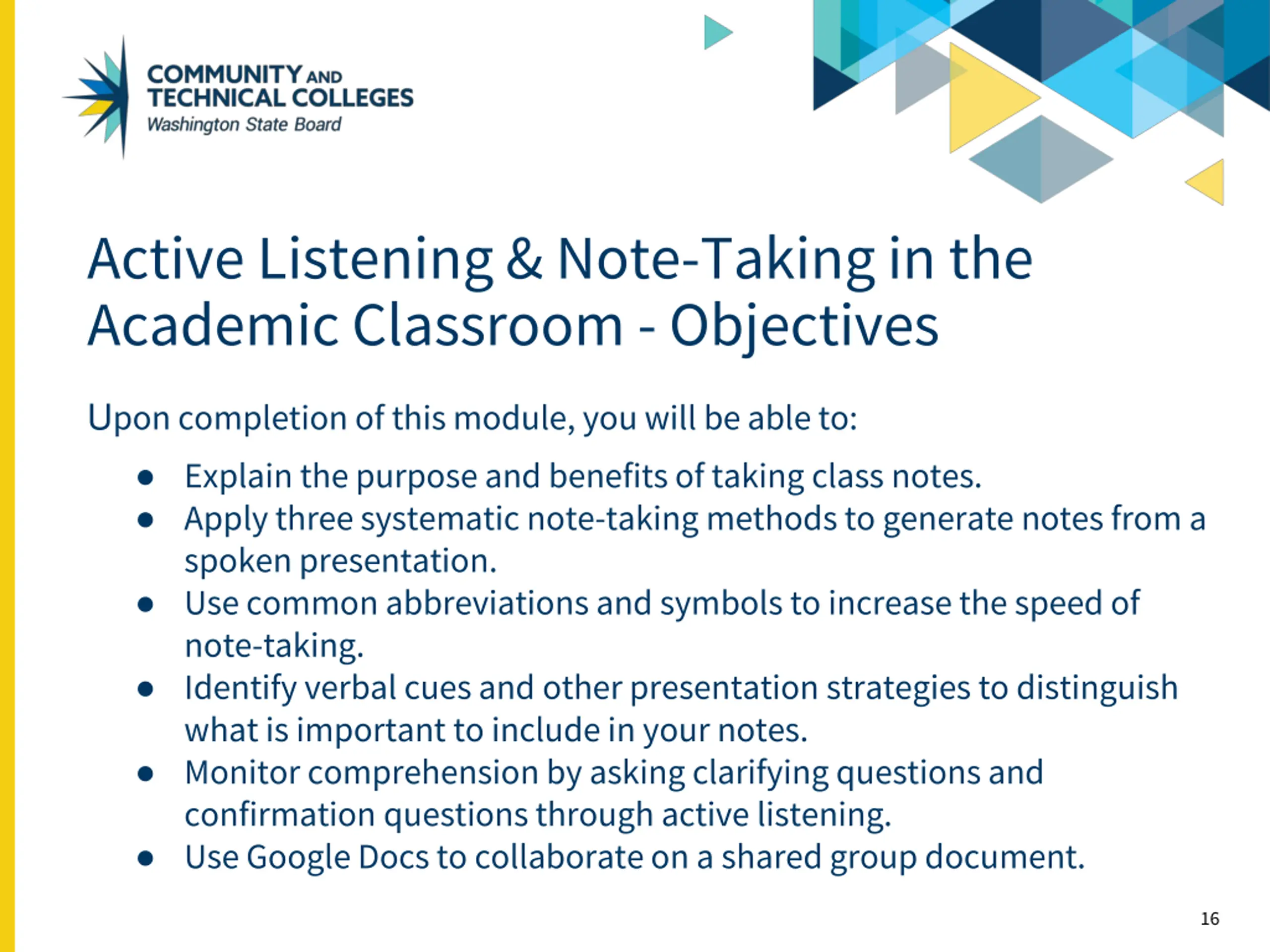 Active Listening & Note-Taking in the Academic Classroom -Objectives Upon completion of this module, you will be able to: Explain the purpose and benefits of taking class notes. Apply three systematic note-taking methods to generate notes from a spoken presentation. Use common abbreviations and symbols to increase the speed of note-taking. Identify verbal cues and other presentation strategies to distinguish what is important to include in your notes. Monitor comprehension by asking clarifying questions and confirmation questions through active listening. Use Google Docs to collaborate on a shared group document. 16
