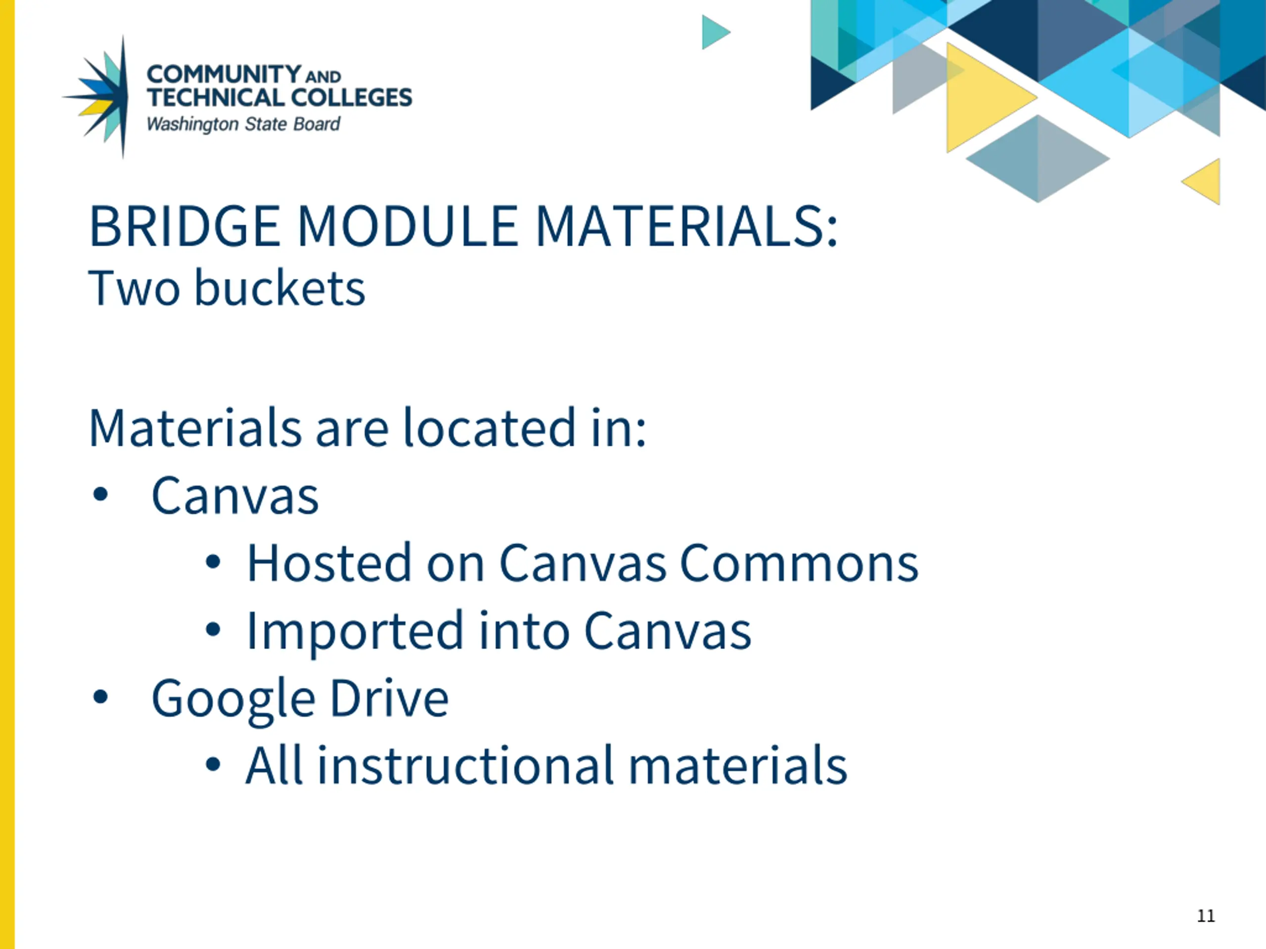 BRIDGE MODULE MATERIALS: Two buckets Materials are located in: Canvas Hosted on Canvas Commons Imported into Canvas Google Drive All instructional materials 11