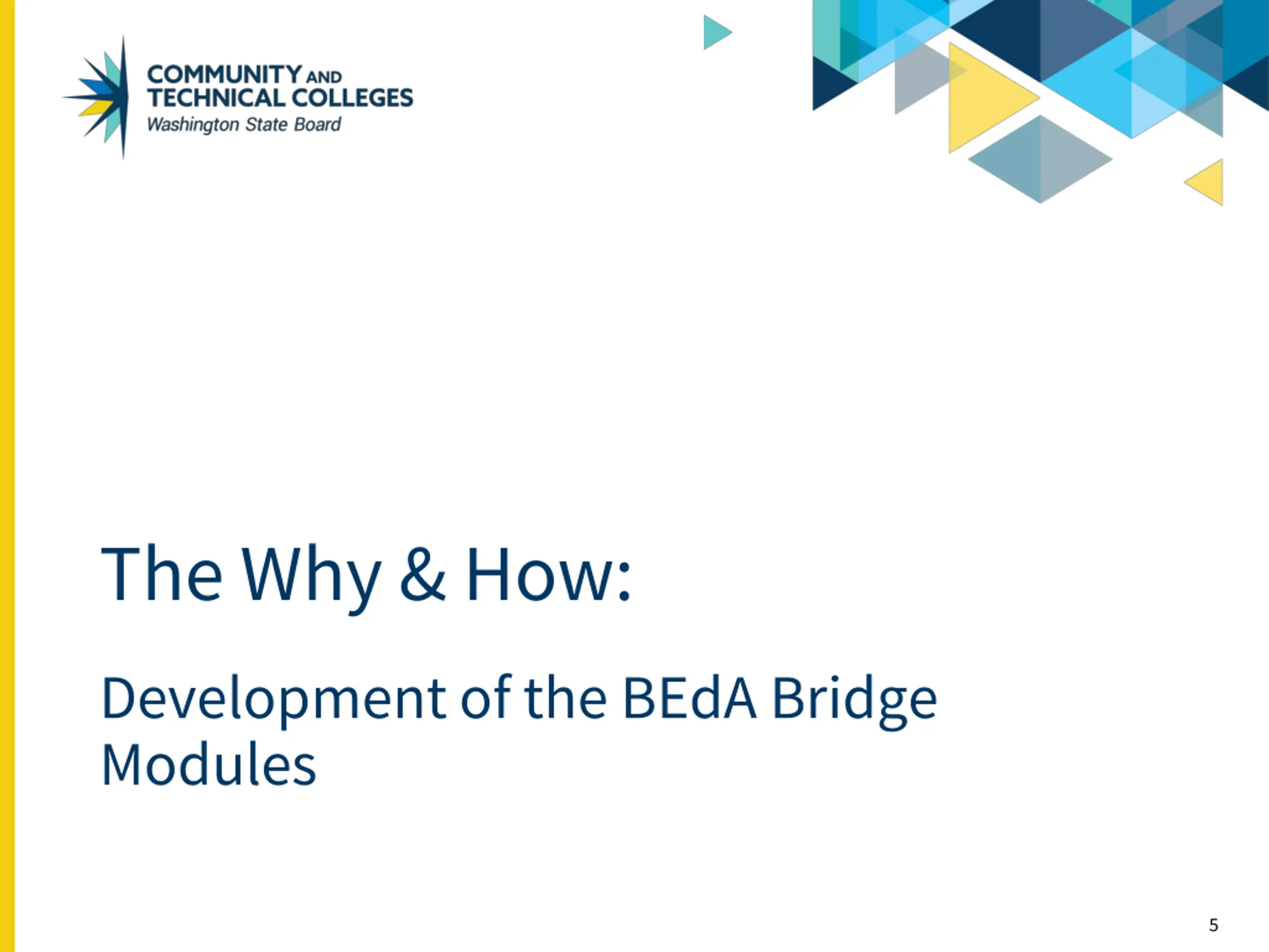 SESSION OUTCOMES Understand the framework of the BEdA Bridge Modules. Describe the resources available to both students and instructors. Locate specific materials in both the online and face-to- face resources. Distinguish how all of or parts of this curriculum can be implemented in your classes. 4