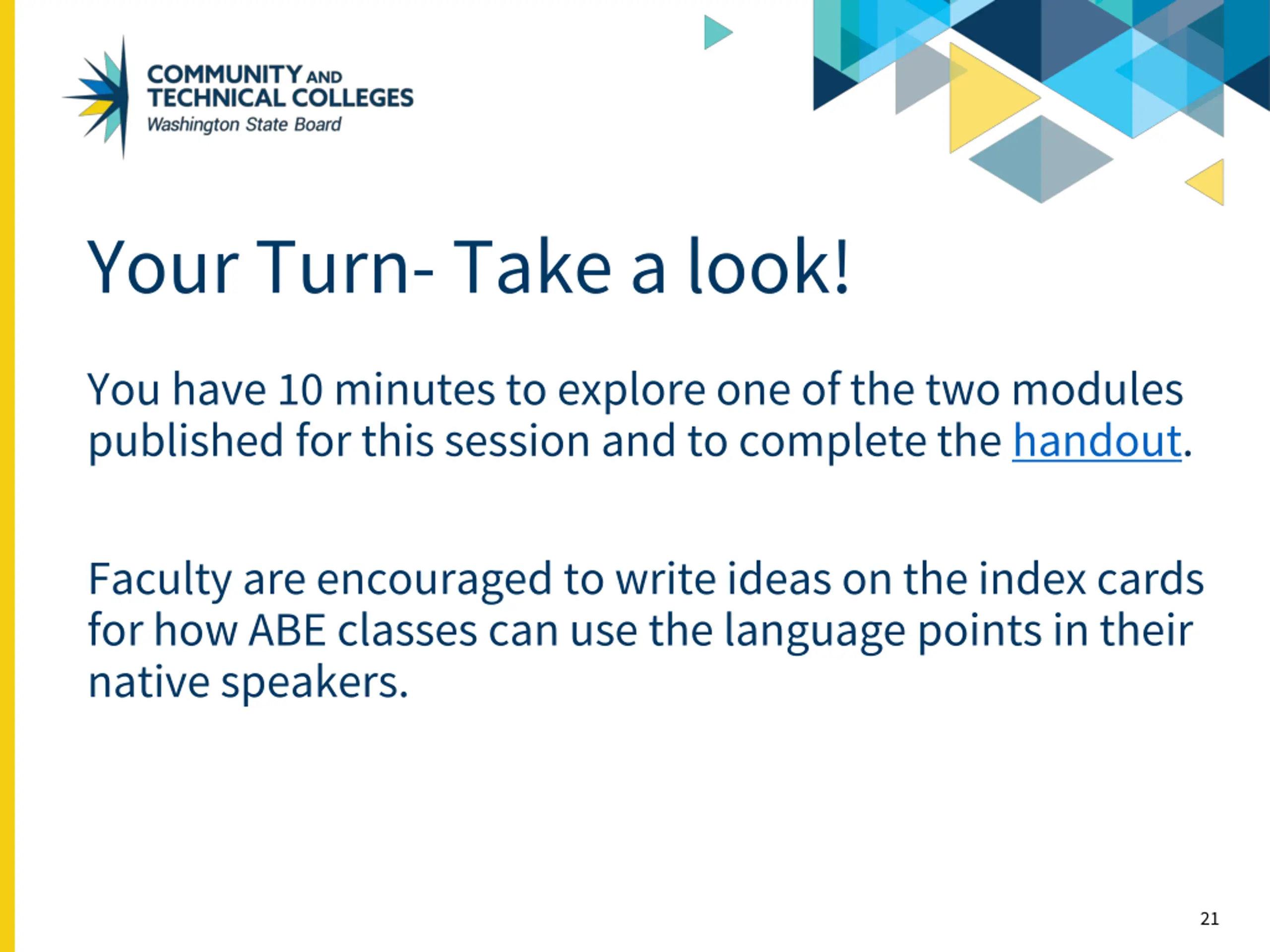 Your Turn- Take a look! You have 10 minutes to explore one of the two modules published for this session and to complete the handout. Faculty are encouraged to write ideas on the index cards for how ABE classes can use the language points in their native speakers. 21