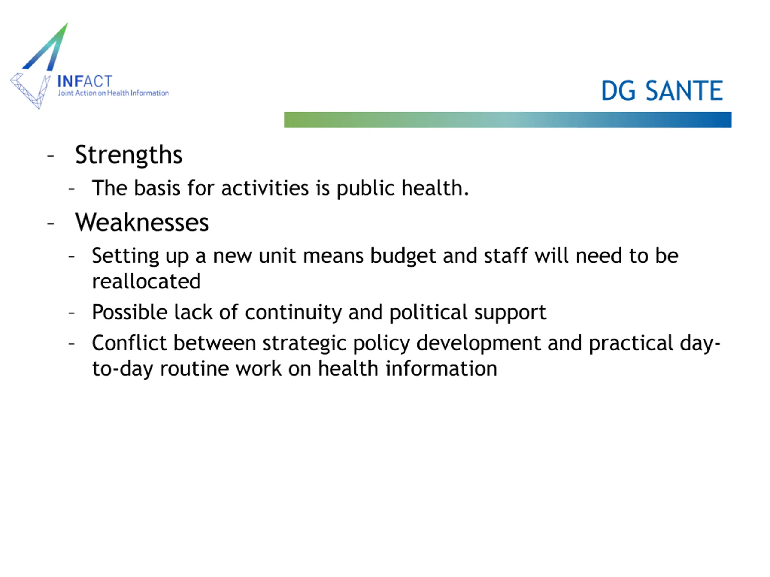 DG SANTE Strengths The basis for activities is public health. Weaknesses Setting up a new unit means budget and staff will need to be reallocated Possible lack of continuity and political support Conflict between strategic policy development and practical day- to-day routine work on health information