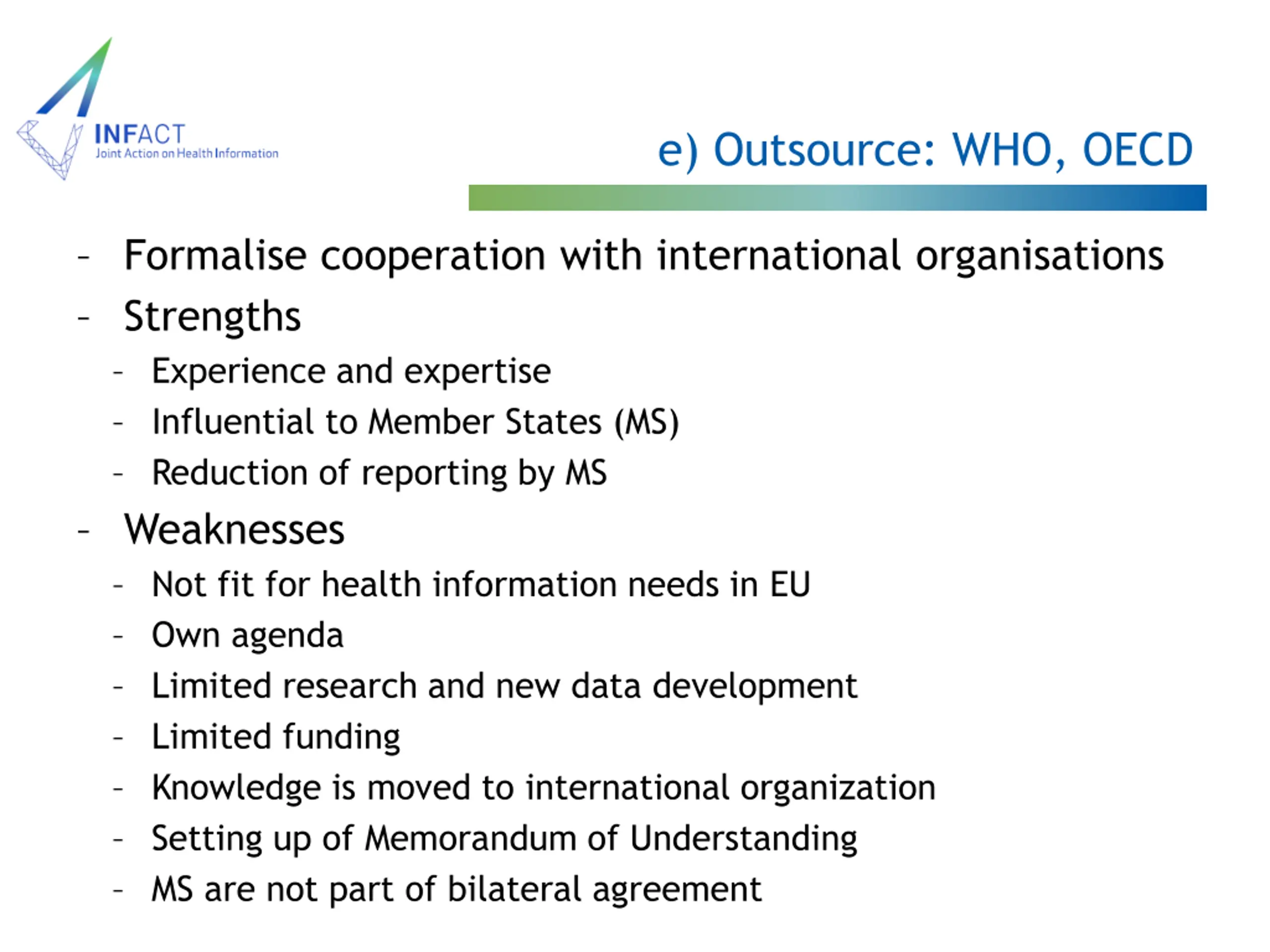 e) Outsource: WHO, OECD Formalise cooperation with international organisations Strengths Experience and expertise Influential to Member States (MS) Reduction of reporting by MS Weaknesses Not fit for health information needs in EU Own agenda Limited research and new data development Limited funding Knowledge is moved to international organization Setting up of Memorandum of Understanding MS are not part of bilateral agreement