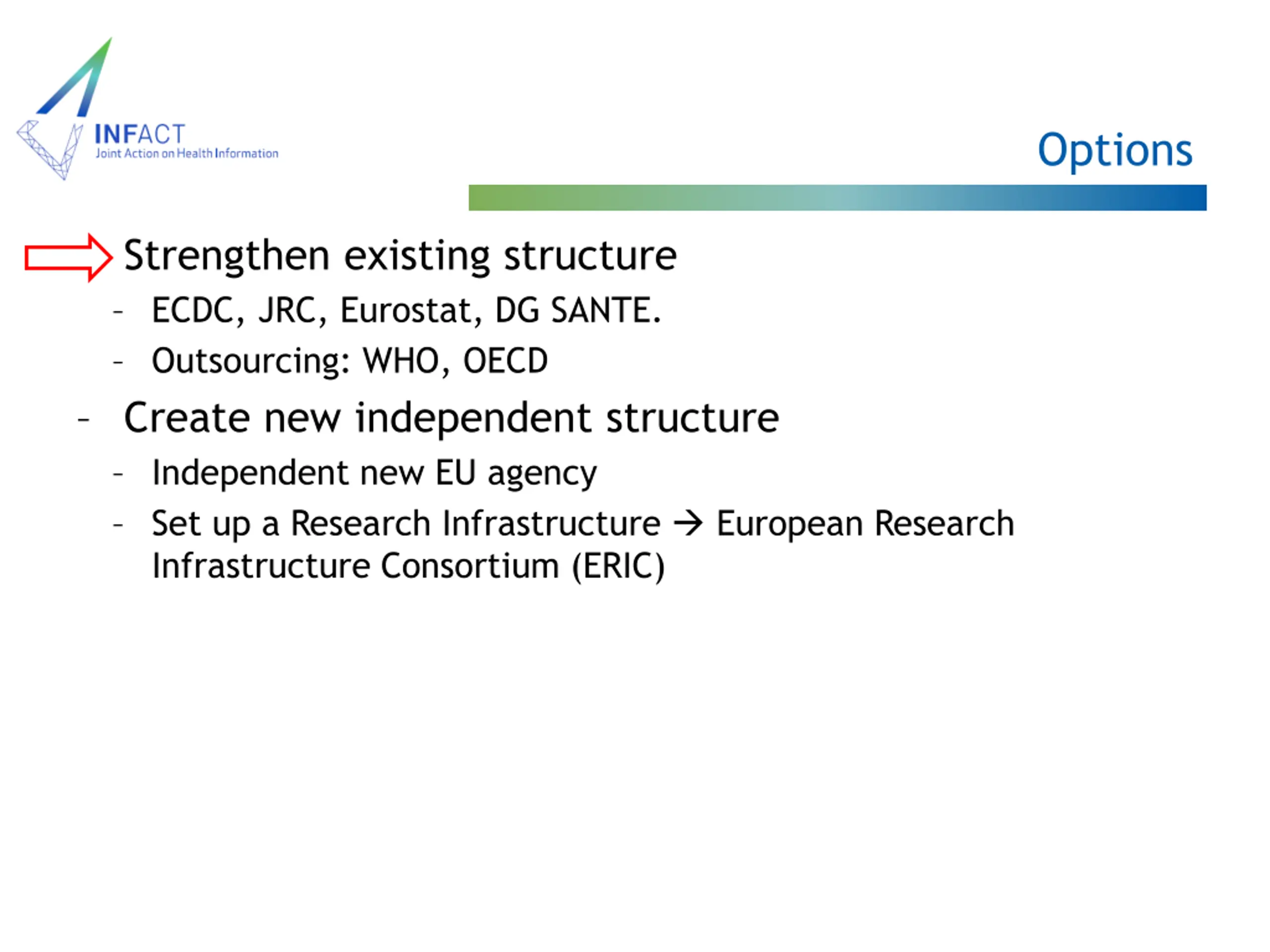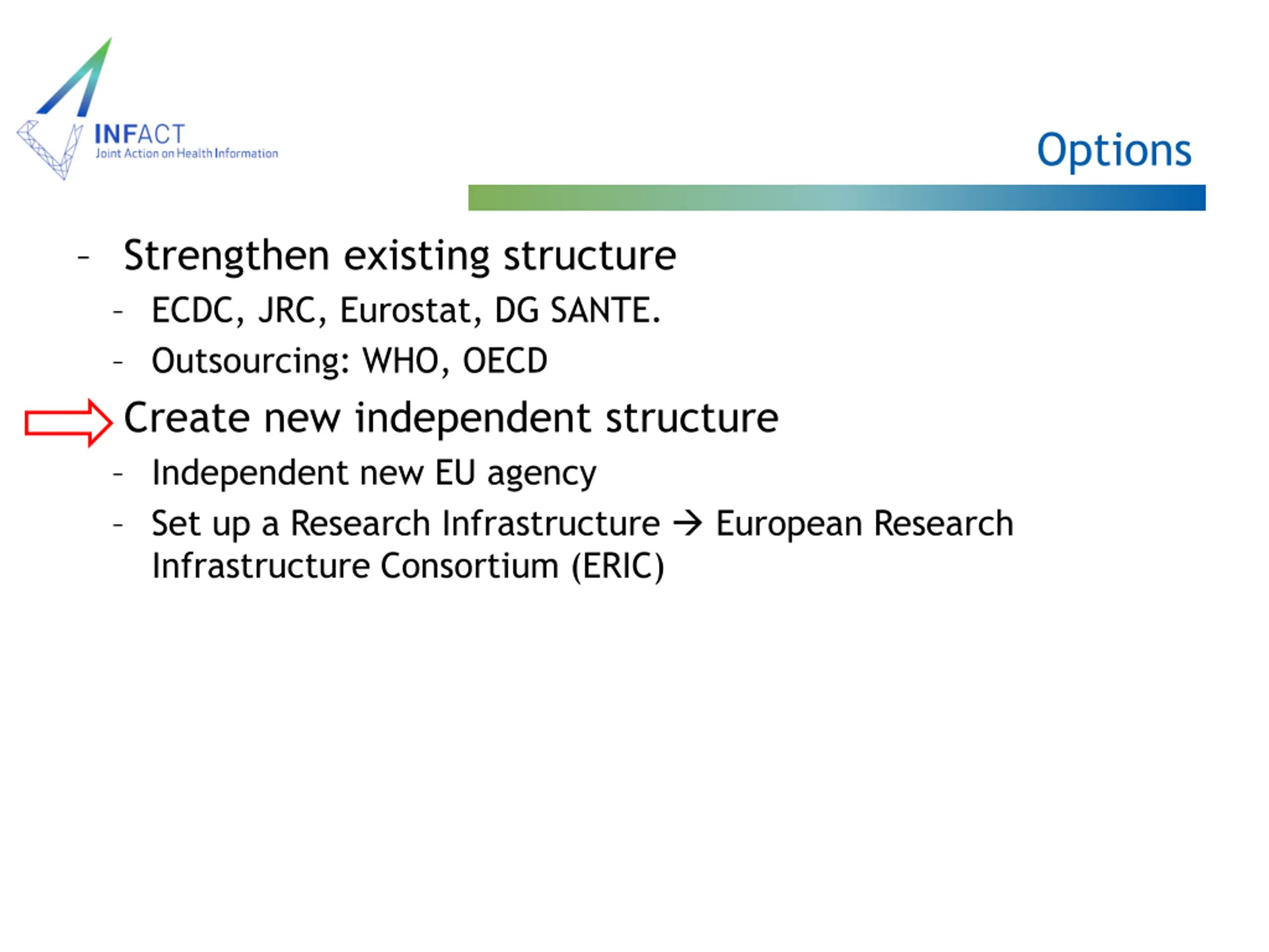 Options Strengthen existing structure ECDC, JRC, Eurostat, DG SANTE. Outsourcing: WHO, OECD Create new independent structure Independent new EU agency Set up a Research Infrastructure European Research Infrastructure Consortium (ERIC)