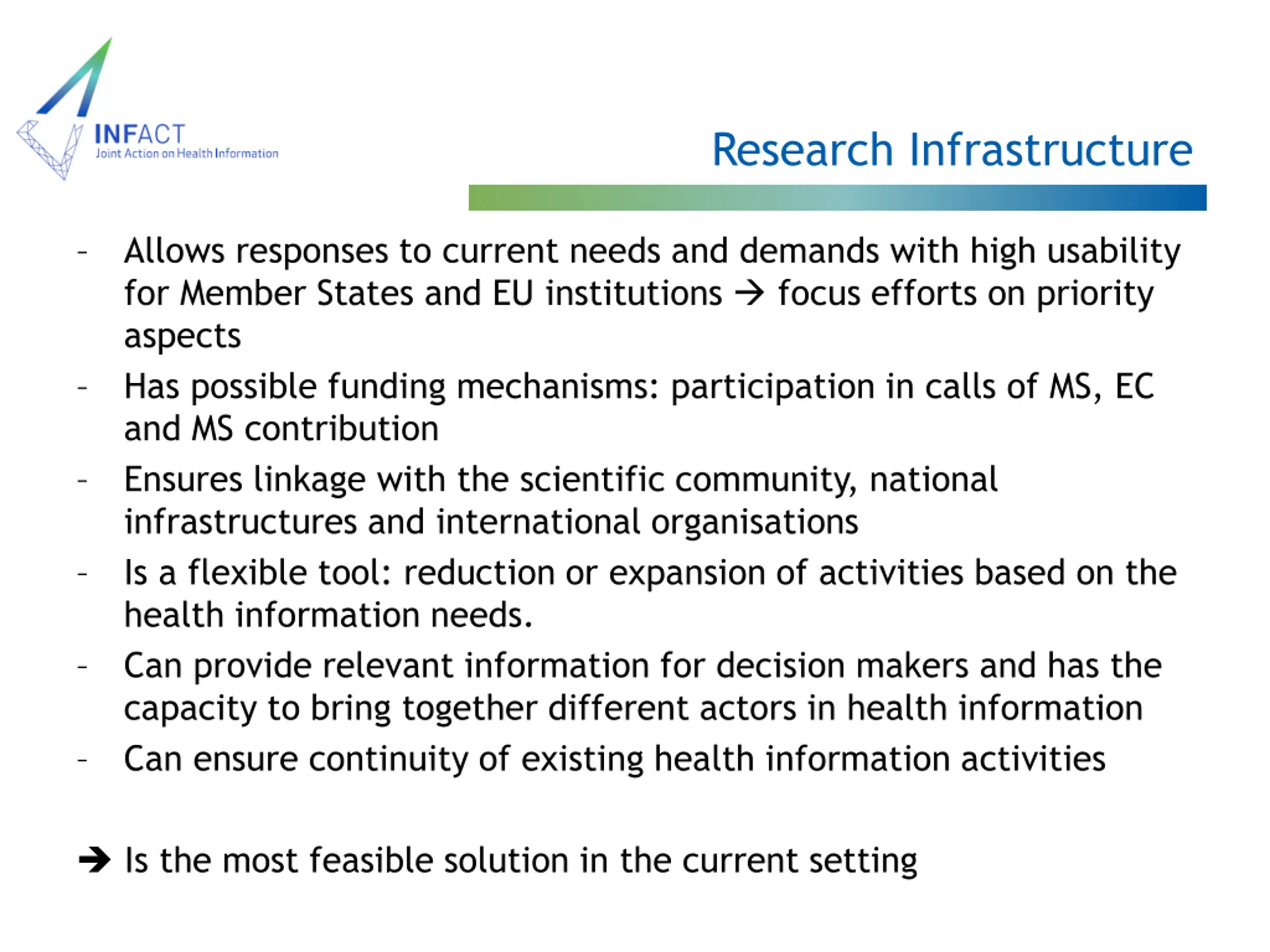 Research Infrastructure Allows responses to current needs and demands with high usability for Member States and EU institutions focus efforts on priority aspects Has possible funding mechanisms: participation in calls of MS, EC and MS contribution Ensures linkage with the scientific community, national infrastructures and international organisations Is a flexible tool: reduction or expansion of activities based on the health information needs. Can provide relevant information for decision makers and has the capacity to bring together different actors in health information Can ensure continuity of existing health information activities Is the most feasible solution in the current setting
