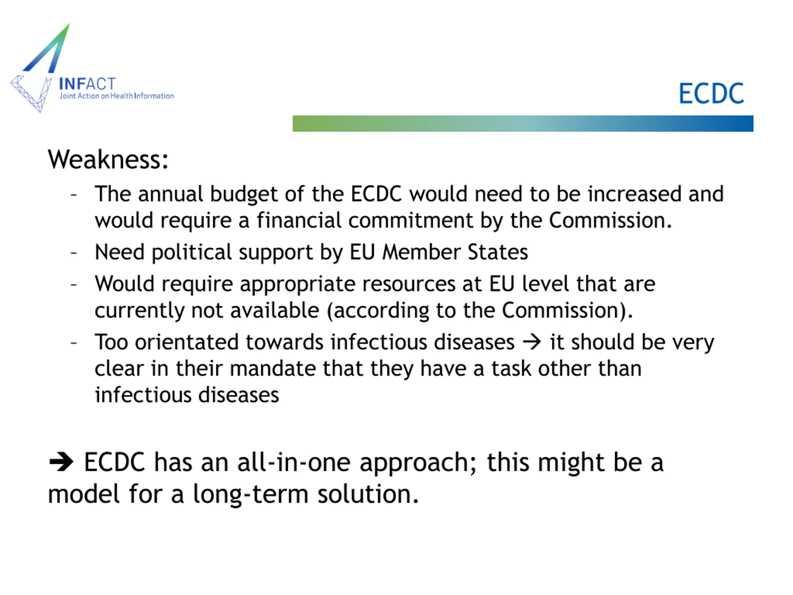 ECDC Weakness: The annual budget of the ECDC would need to be increased and would require a financial commitment by the Commission. Need political support by EU Member States Would require appropriate resources at EU level that are currently not available (according to the Commission). Too orientated towards infectious diseases it should be very clear in their mandate that they have a task other than infectious diseases ECDC has an all-in-one approach; this might be a model for a long-term solution.
