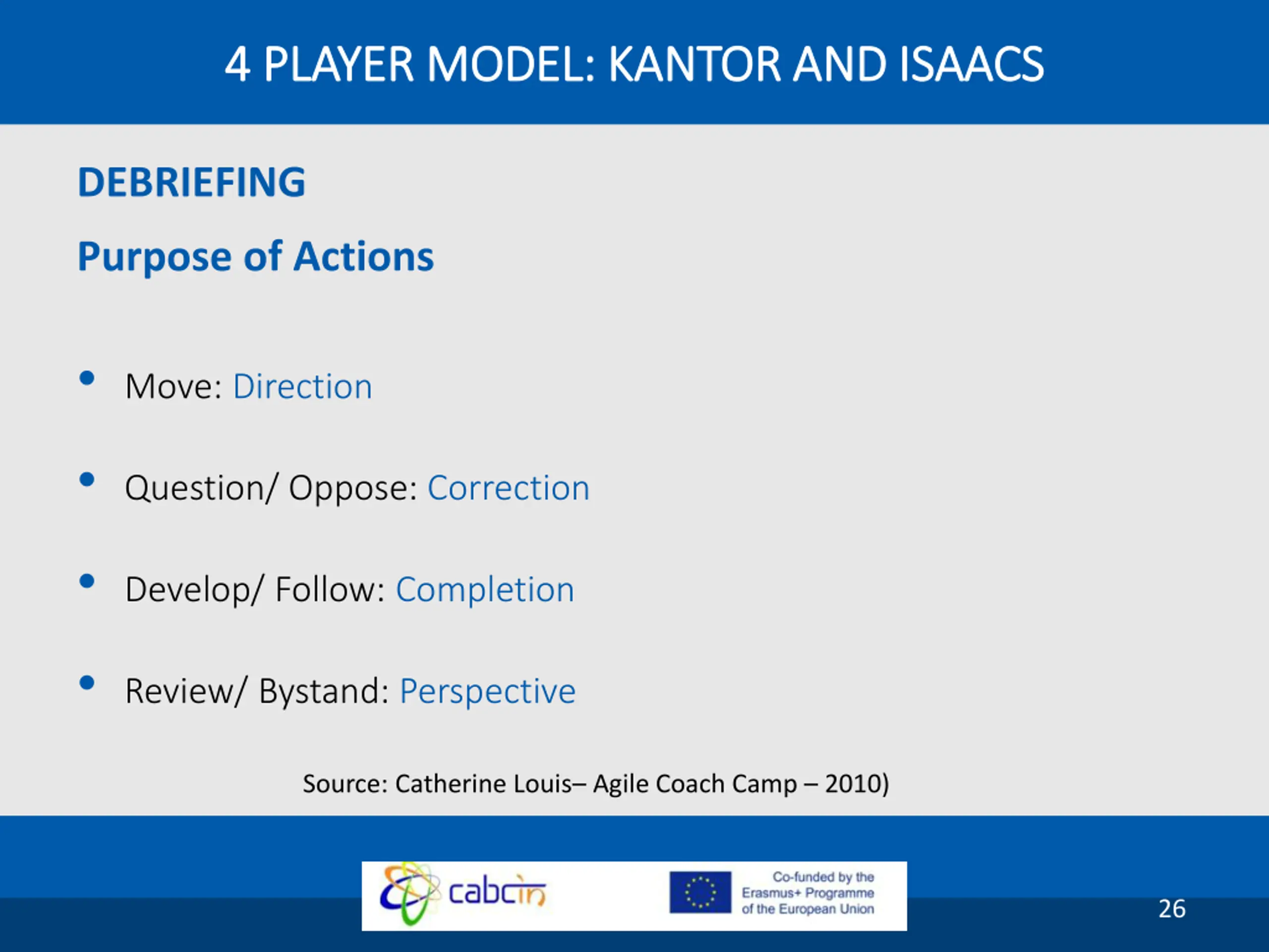 4 PLAYER MODEL: KANTOR AND ISAACS 4 PLAYER MODEL: KANTOR AND ISAACS DEBRIEFING Purpose of Actions Move: Direction Question/ Oppose: Correction Develop/ Follow: Completion Review/ Bystand: Perspective Source: Catherine Louis Agile Coach Camp 2010) 26
