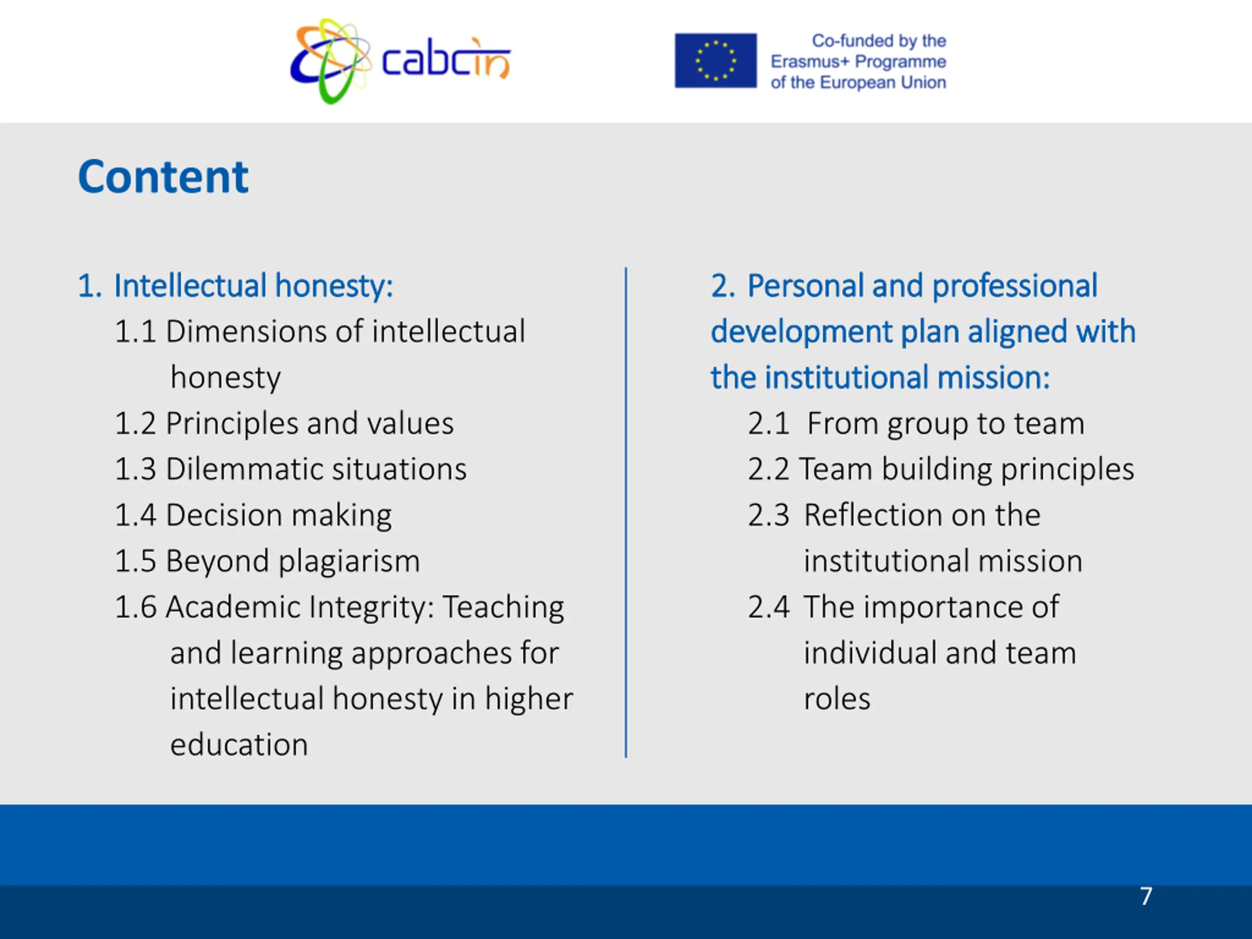 Content 1. 1. Intellectual honesty: Intellectual honesty: 1.1 Dimensions of intellectual honesty 1.2 Principles and values 1.3 Dilemmatic situations 1.4 Decision making 1.5 Beyond plagiarism 1.6 Academic Integrity: Teaching and learning approaches for intellectual honesty in higher education 2. 2. Personal and professional Personal and professional development development plan aligned with plan aligned with the institutional mission: the institutional mission: 2.1 From group to team 2.2 Team building principles 2.3 Reflection on the institutional mission 2.4 The importance of individual and team roles 7