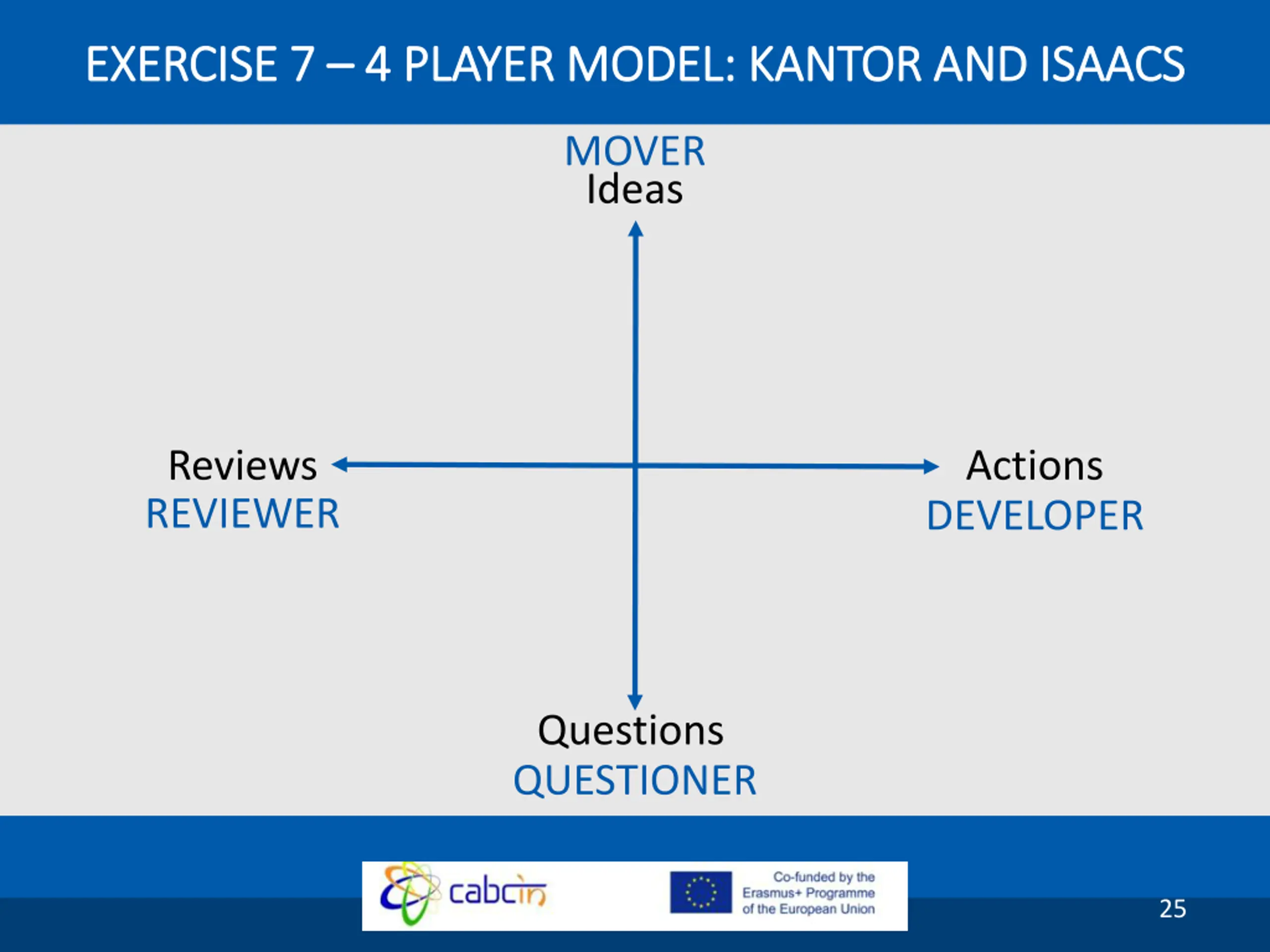 EXERCISE EXERCISE 7 7 4 PLAYER MODEL: KANTOR AND ISAACS 4 PLAYER MODEL: KANTOR AND ISAACS MOVER Ideas Reviews REVIEWER Actions DEVELOPER Questions QUESTIONER 25