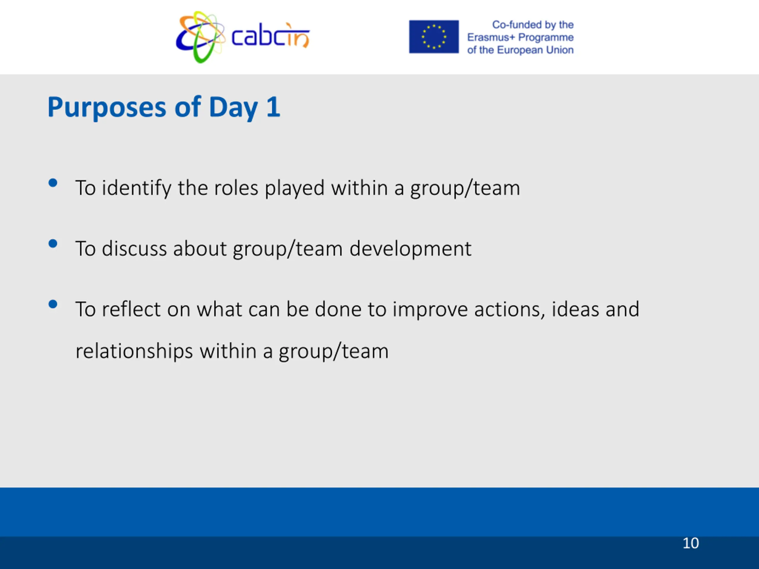 Purposes of Day 1 To identify the roles played within a group/team To discuss about group/team development To reflect on what can be done to improve actions, ideas and relationships within a group/team 10