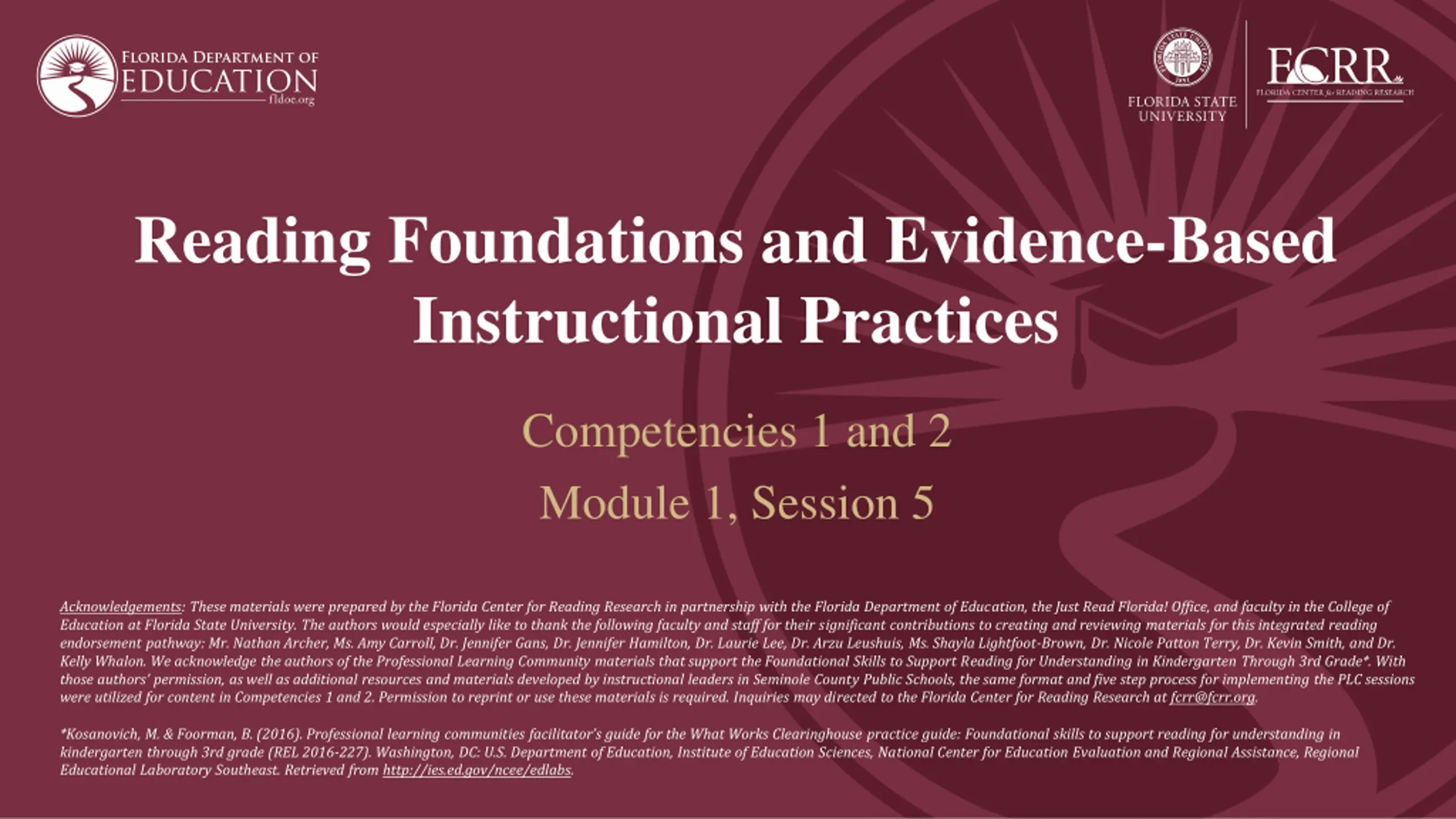 Reading Foundations and Evidence-Based Instructional Practices Competencies 1 and 2 Module 1, Session 5 Acknowledgements: These materials were prepared by the Florida Center for Reading Research in partnership with the Florida Department of Education, the Just Read Florida! Office, and faculty in the College of Education at Florida State University. The authors would especially like to thank the following faculty and staff for their significant contributions to creating and reviewing materials for this integrated reading endorsement pathway: Mr. Nathan Archer, Ms. Amy Carroll, Dr. Jennifer Gans, Dr. Jennifer Hamilton, Dr. Laurie Lee, Dr. Arzu Leushuis, Ms. Shayla Lightfoot-Brown, Dr. Nicole Patton Terry, Dr. Kevin Smith, and Dr. Kelly Whalon. We acknowledge the authors of the Professional Learning Community materials that support the Foundational Skills to Support Reading for Understanding in Kindergarten Through 3rd Grade*. With those authors' permission, as well as additional resources and materials developed by instructional leaders in Seminole County Public Schools, the same format and five step process for implementing the PLC sessions were utilized for content in Competencies 1 and 2. Permission to reprint or use these materials is required. Inquiries may directed to the Florida Center for Reading Research at fcrr@fcrr.org. *Kosanovich, M. & Foorman, B. (2016). Professional learning communities facilitator s guide for the What Works Clearinghouse practice guide: Foundational skills to support reading for understanding in kindergarten through 3rd grade (REL 2016-227). Washington, DC: U.S. Department of Education, Institute of Education Sciences, National Center for Education Evaluation and Regional Assistance, Regional Educational Laboratory Southeast. Retrieved from http://ies.ed.gov/ncee/edlabs.