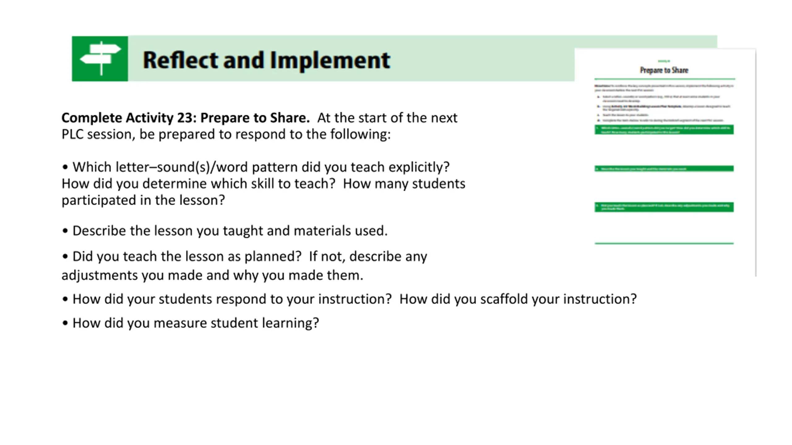 Complete Activity 23: Prepare to Share. At the start of the next PLC session, be prepared to respond to the following: Which letter sound(s)/word pattern did you teach explicitly? How did you determine which skill to teach? How many students participated in the lesson? Describe the lesson you taught and materials used. Did you teach the lesson as planned? If not, describe any adjustments you made and why you made them. How did your students respond to your instruction? How did you scaffold your instruction? How did you measure student learning?