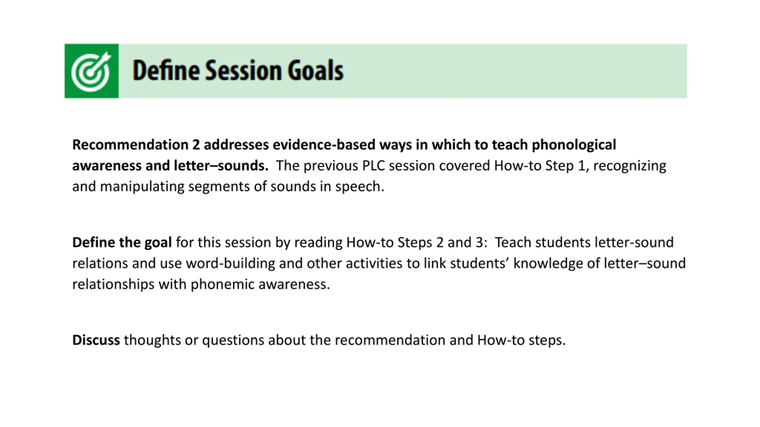 Recommendation 2 addresses evidence-based ways in which to teach phonological awareness and letter sounds. The previous PLC session covered How-to Step 1, recognizing and manipulating segments of sounds in speech. Define the goal for this session by reading How-to Steps 2 and 3: Teach students letter-sound relations and use word-building and other activities to link students knowledge of letter sound relationships with phonemic awareness. Discuss thoughts or questions about the recommendation and How-to steps.