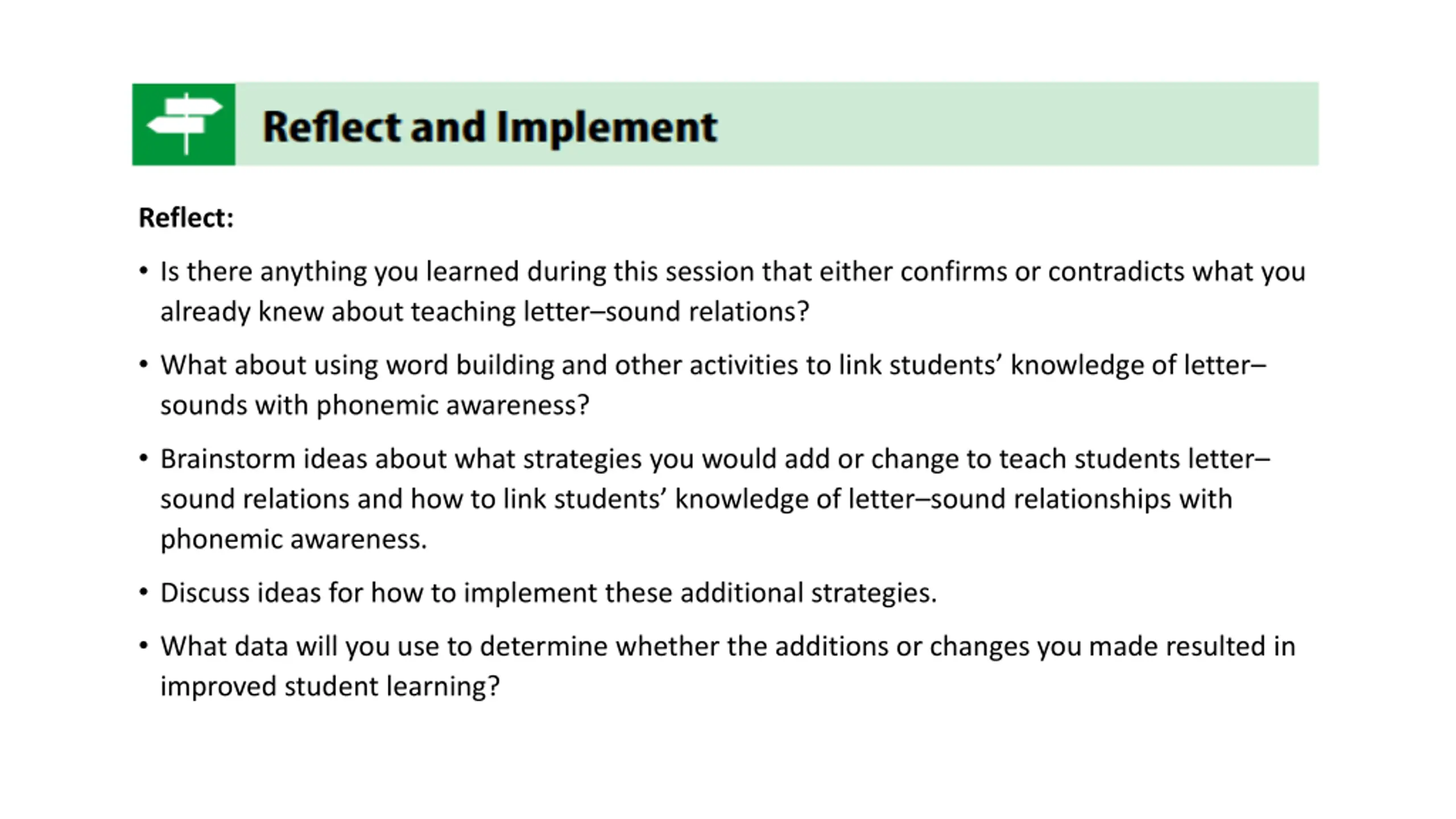 Reflect: Is there anything you learned during this session that either confirms or contradicts what you already knew about teaching letter sound relations? What about using word building and other activities to link students knowledge of letter sounds with phonemic awareness? Brainstorm ideas about what strategies you would add or change to teach students letter sound relations and how to link students knowledge of letter sound relationships with phonemic awareness. Discuss ideas for how to implement these additional strategies. What data will you use to determine whether the additions or changes you made resulted in improved student learning?