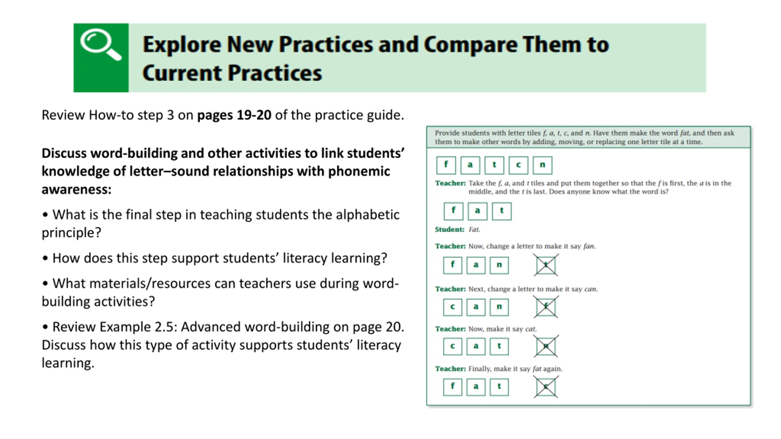 Review How-to step 3 on pages 19-20 of the practice guide. Discuss word-building and other activities to link students knowledge of letter sound relationships with phonemic awareness: What is the final step in teaching students the alphabetic principle? How does this step support students literacy learning? What materials/resources can teachers use during word- building activities? Review Example 2.5: Advanced word-building on page 20. Discuss how this type of activity supports students literacy learning.