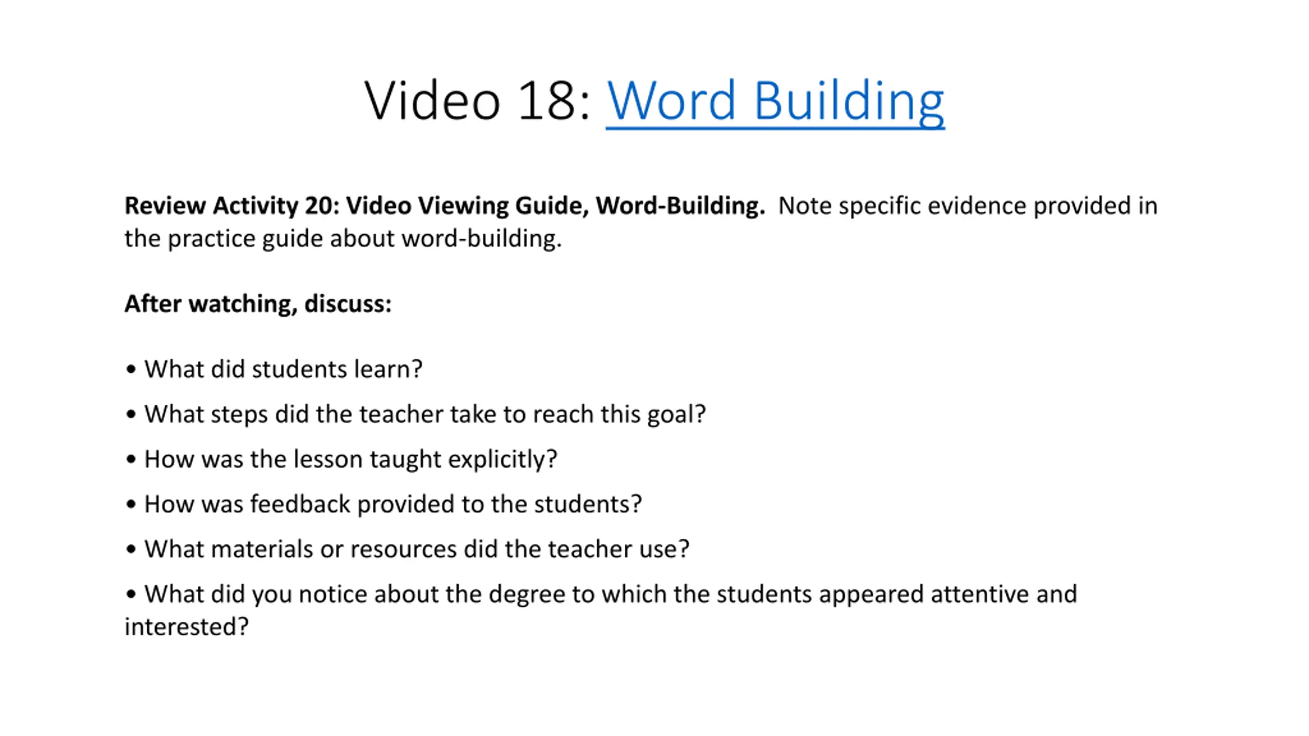 Video 18: Word Building Review Activity 20: Video Viewing Guide, Word-Building. Note specific evidence provided in the practice guide about word-building. After watching, discuss: What did students learn? What steps did the teacher take to reach this goal? How was the lesson taught explicitly? How was feedback provided to the students? What materials or resources did the teacher use? What did you notice about the degree to which the students appeared attentive and interested?