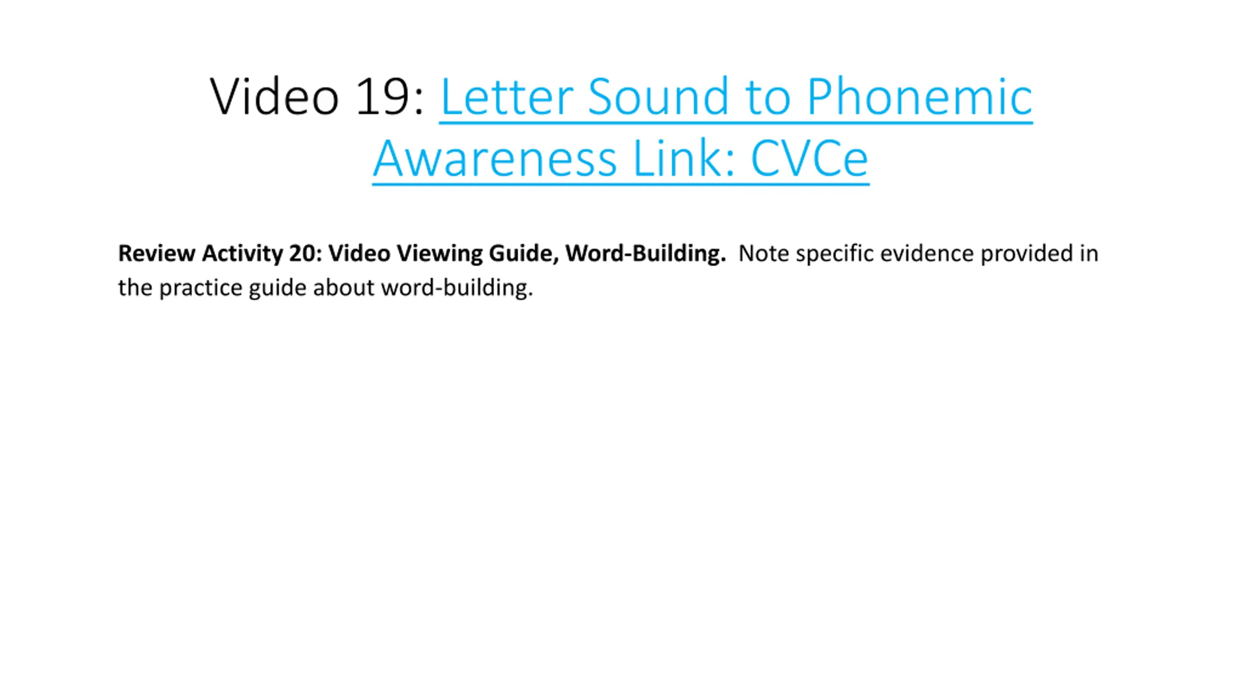 Video 19: Letter Sound to Phonemic Awareness Link: CVCe Review Activity 20: Video Viewing Guide, Word-Building. Note specific evidence provided in the practice guide about word-building.