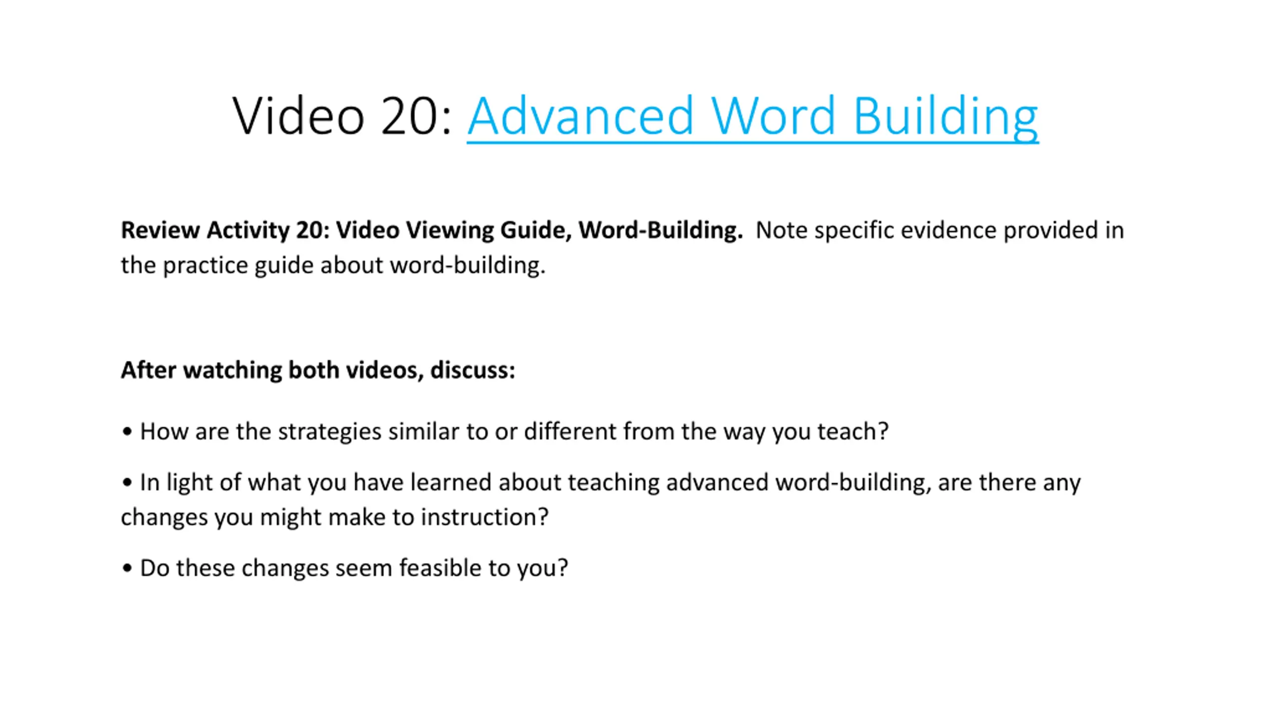 Video 20: Advanced Word Building Review Activity 20: Video Viewing Guide, Word-Building. Note specific evidence provided in the practice guide about word-building. After watching both videos, discuss: How are the strategies similar to or different from the way you teach? In light of what you have learned about teaching advanced word-building, are there any changes you might make to instruction? Do these changes seem feasible to you?