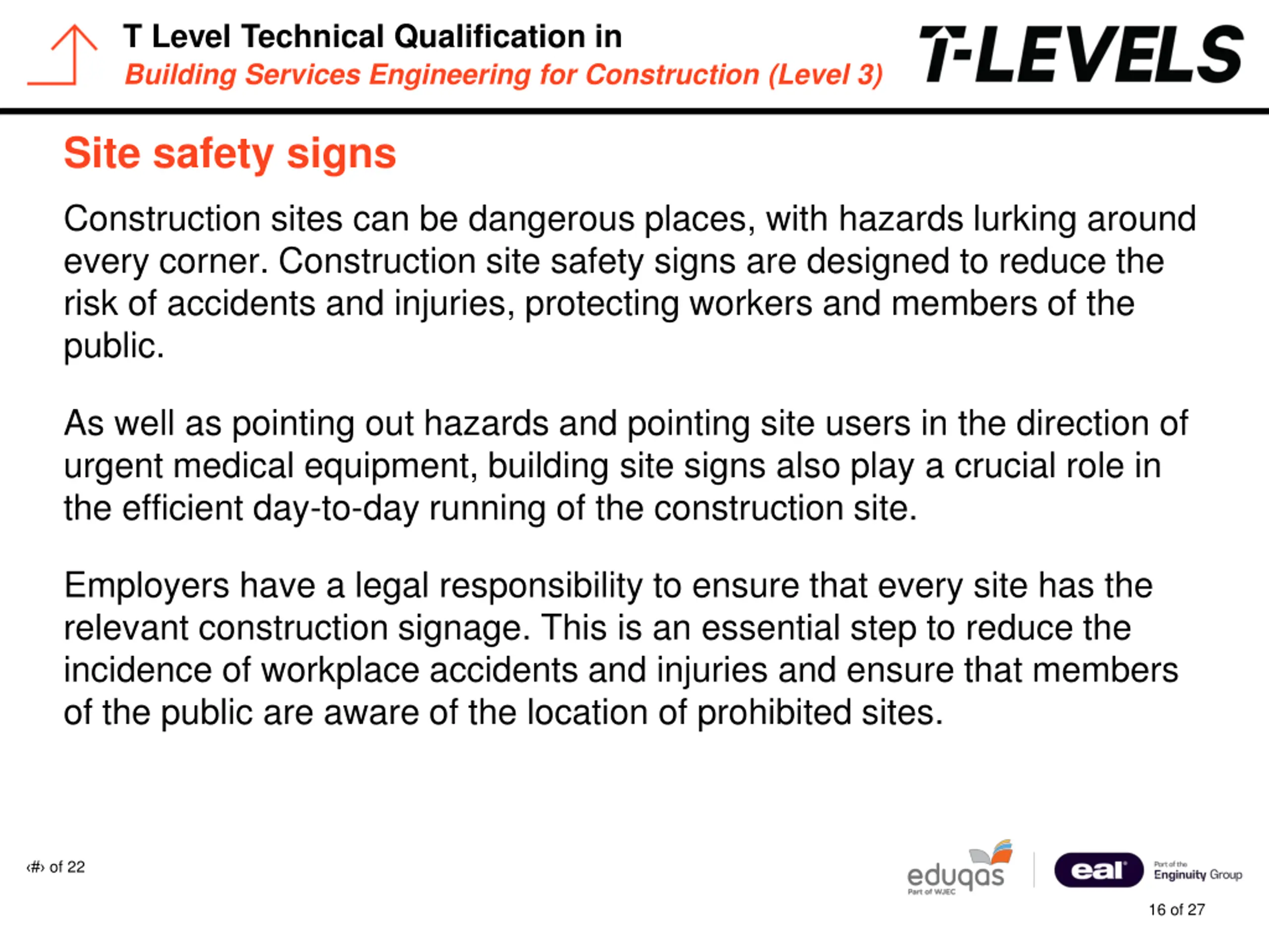 T Level Technical Qualification in Building Services Engineering for Construction (Level 3) Site safety signs Construction sites can be dangerous places, with hazards lurking around every corner. Construction site safety signs are designed to reduce the risk of accidents and injuries, protecting workers and members of the public. As well as pointing out hazards and pointing site users in the direction of urgent medical equipment, building site signs also play a crucial role in the efficient day-to-day running of the construction site. Employers have a legal responsibility to ensure that every site has the relevant construction signage. This is an essential step to reduce the incidence of workplace accidents and injuries and ensure that members of the public are aware of the location of prohibited sites. # of 22 16 of 27