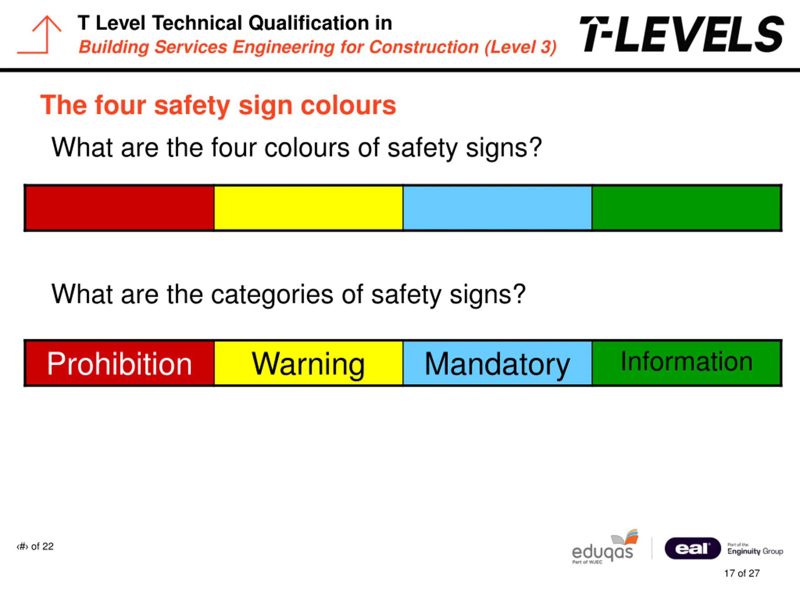 T Level Technical Qualification in Building Services Engineering for Construction (Level 3) The four safety sign colours What are the four colours of safety signs? What are the categories of safety signs? Mandatory Information Prohibition Warning # of 22 17 of 27
