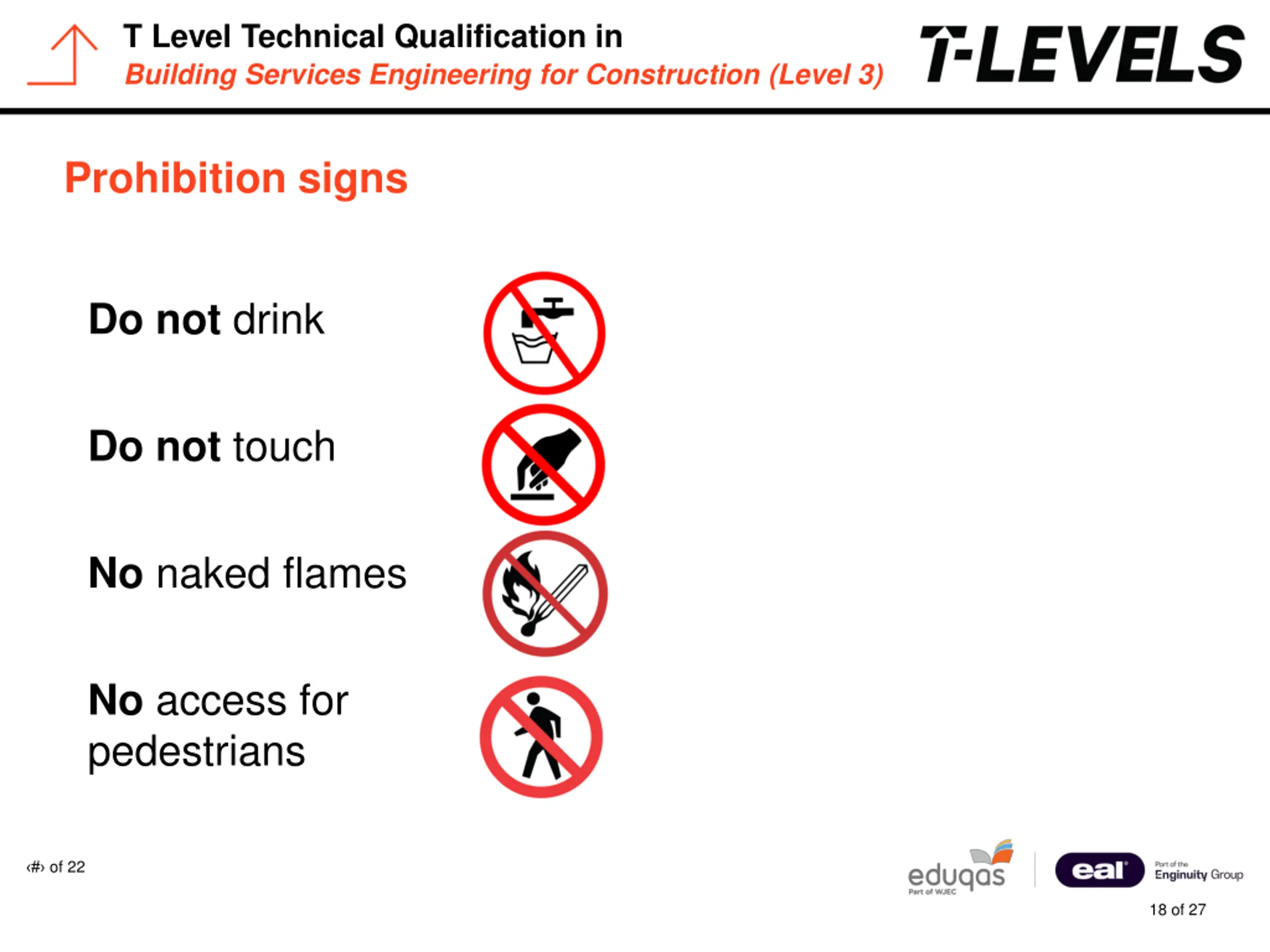 T Level Technical Qualification in Building Services Engineering for Construction (Level 3) Prohibition signs Do not drink Do not touch No naked flames No access for pedestrians # of 22 18 of 27
