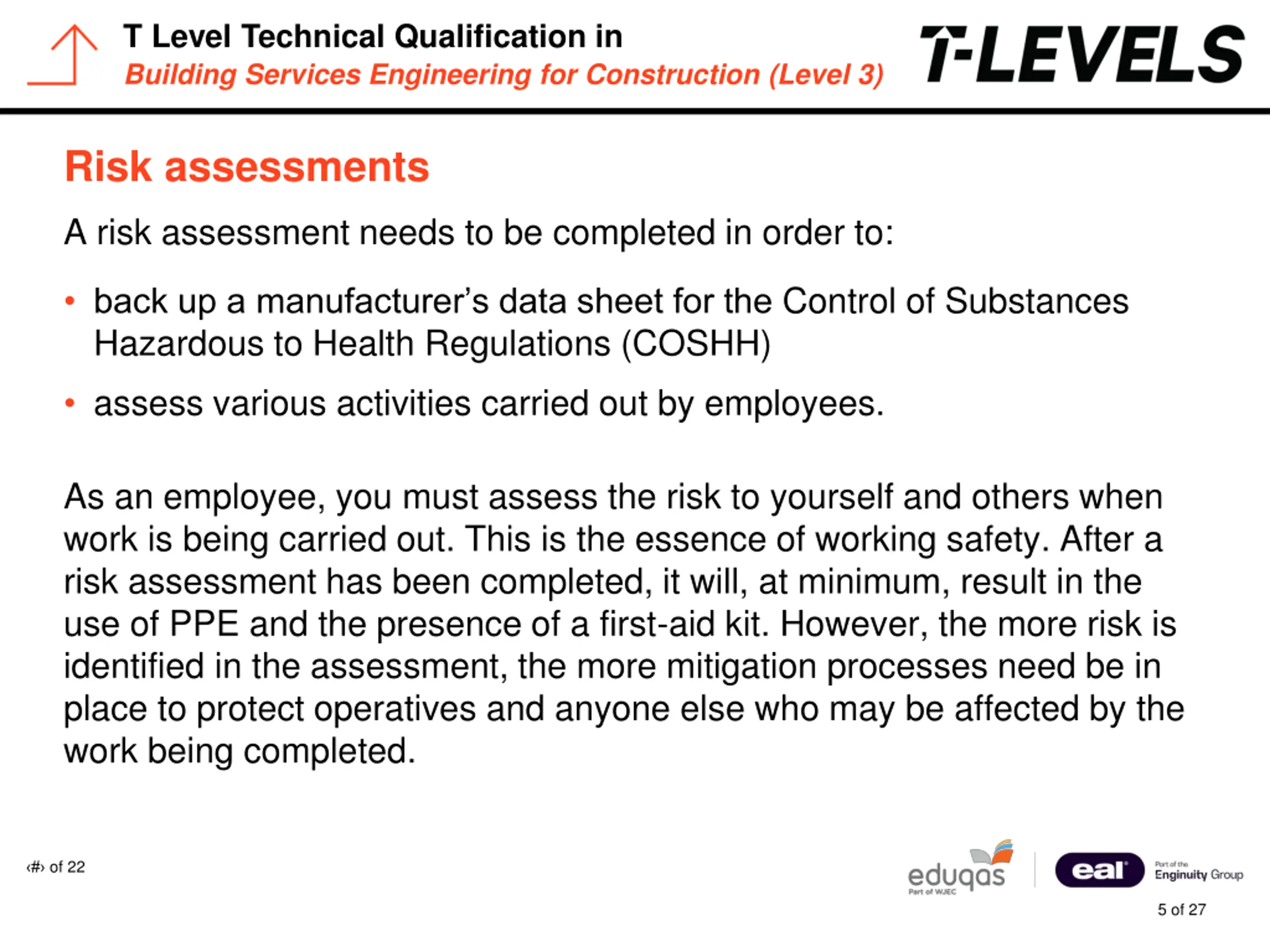 T Level Technical Qualification in Building Services Engineering for Construction (Level 3) Risk assessments A risk assessment needs to be completed in order to: back up a manufacturer s data sheet for the Control of Substances Hazardous to Health Regulations (COSHH) assess various activities carried out by employees. As an employee, you must assess the risk to yourself and others when work is being carried out. This is the essence of working safety. After a risk assessment has been completed, it will, at minimum, result in the use of PPE and the presence of a first-aid kit. However, the more risk is identified in the assessment, the more mitigation processes need be in place to protect operatives and anyone else who may be affected by the work being completed. # of 22 5 of 27